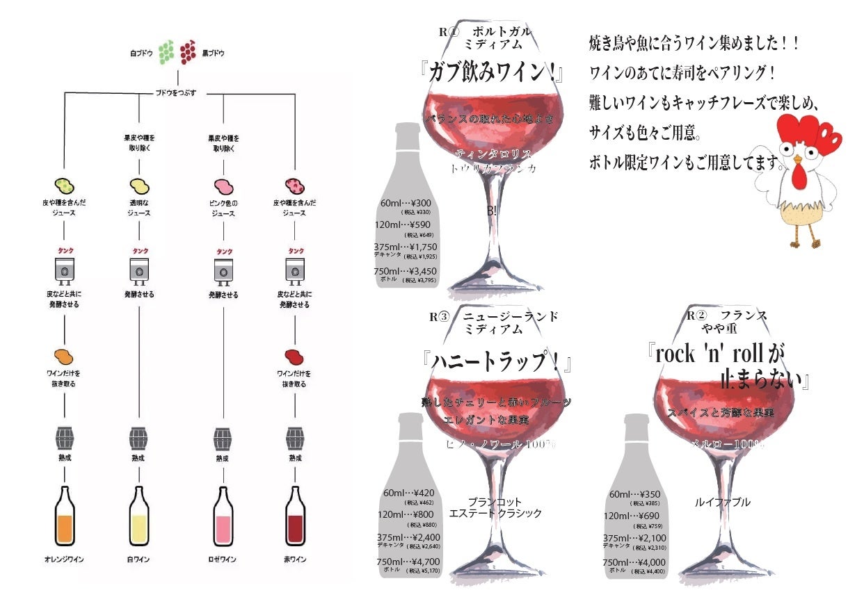 焼鳥や魚に合うワインを取り揃えました。白ワインと一緒にあて寿司をペアリングや、赤のフルボディと焼き鳥のタレを合わせるのも◎。読みにくいワインの銘柄名を当店のスタッフで、各ワインに合わせたネーミングに変更し、遊び心を持たせました。60ml~フルボトルまで、4種類のサイズをご用意。お好みに応じてオーダーくださいませ。