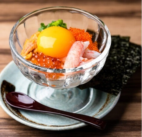 うに、いくら、蟹、とびっこに、濃厚な卵黄を絡める極上品。口の中に入れると、バラエティー豊かな食感をお楽しみください。