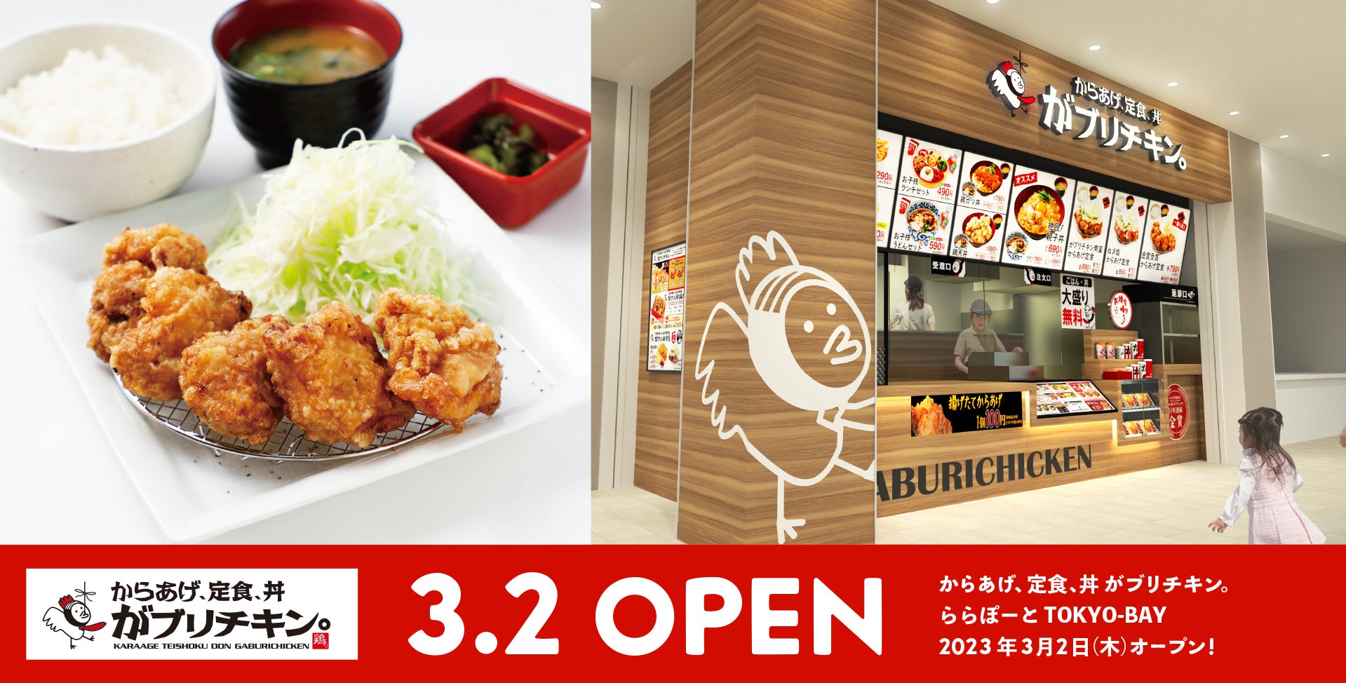 株式会社ブルームダイニングサービス(所在地:名古屋市中村区、代表取締役:杉村 明紀)が運営する飲食ブランド「がブリチキン。」は、新業態「からあげ、定食、丼 がブリチキン。」千葉県1号店となる「からあげ、定食、丼 がブリチキン。ららぽーとTOKYO-BAY店」を、2023年3月2日(木)にグランドオープンいたします。愛知県にある新業態1号店の「ららぽーと名古屋みなとアクルス店」では、老若男女問わず親しまれており、「がブリチキン。から、定食や丼が出てくれて嬉しい」「お買い物帰りにテイクアウトが出来て、ご飯のおかずが助かる」などと、大好評をいただいております。
