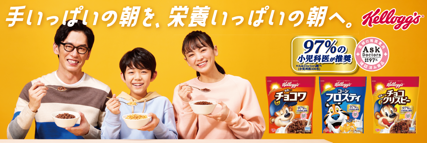 100名以上の医師が評価に携わり、一定の基準以上の推奨意向が得られた製品だけが認定される「AskDoctors」。今回ケロッグの子ども向けシリアル3製品「コーンフロスティ」「ココくんのチョコワ」「ココくんのチョコクリスピー」の評価を行ったところ、100名のうち97%の小児科医から推奨され、AskDoctorsマークを取得しました。さらに、94%の医師から「成長期の子どもの栄養摂取におすすめ」と回答されました。本結果を受け、成長期のお子様を持つ親御様に、より安心と信頼のもと、製品を手に取っていただけるよう、パッケージの前面に「97%の小児科医が推奨」という文言と、「AskDoctors」マークを分かりやすく記載することといたしました。