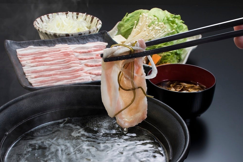 平田牧場金華豚は、純粋金華豚との交配豚。甘みとコクに富んだ白身(脂)をもつ、ワンランク上の上質な味わいが特徴。しゃぶしゃぶした豚肉を付けて食べる「とびうおのだし」、しゃぶしゃぶ鍋に入れて召し上がれる「きざみ昆布」がセットになっています。