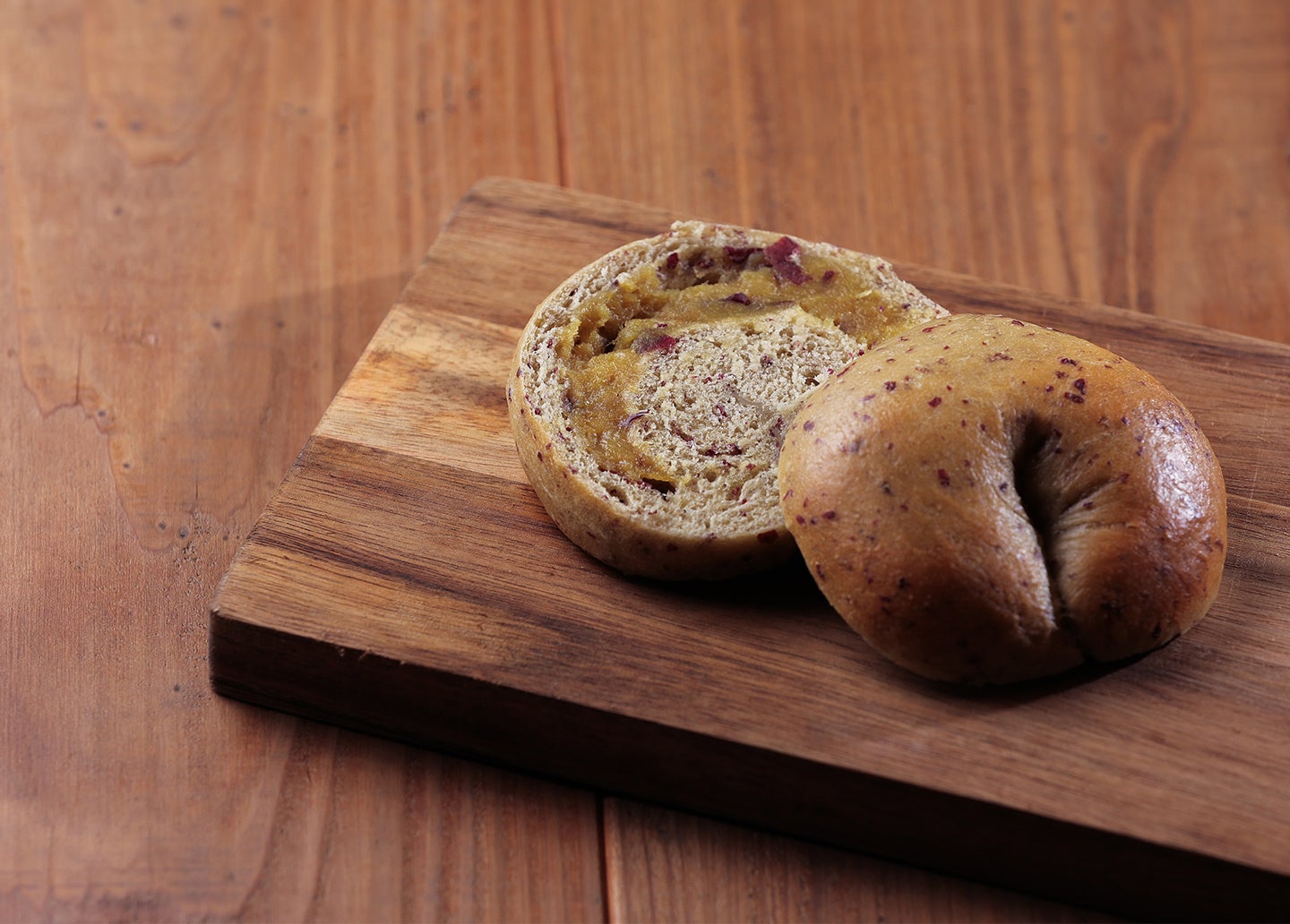 ・蜜芋ベーグル(干し芋入)では、皮ごと干した干し芋が、ゴロゴロ入っています。