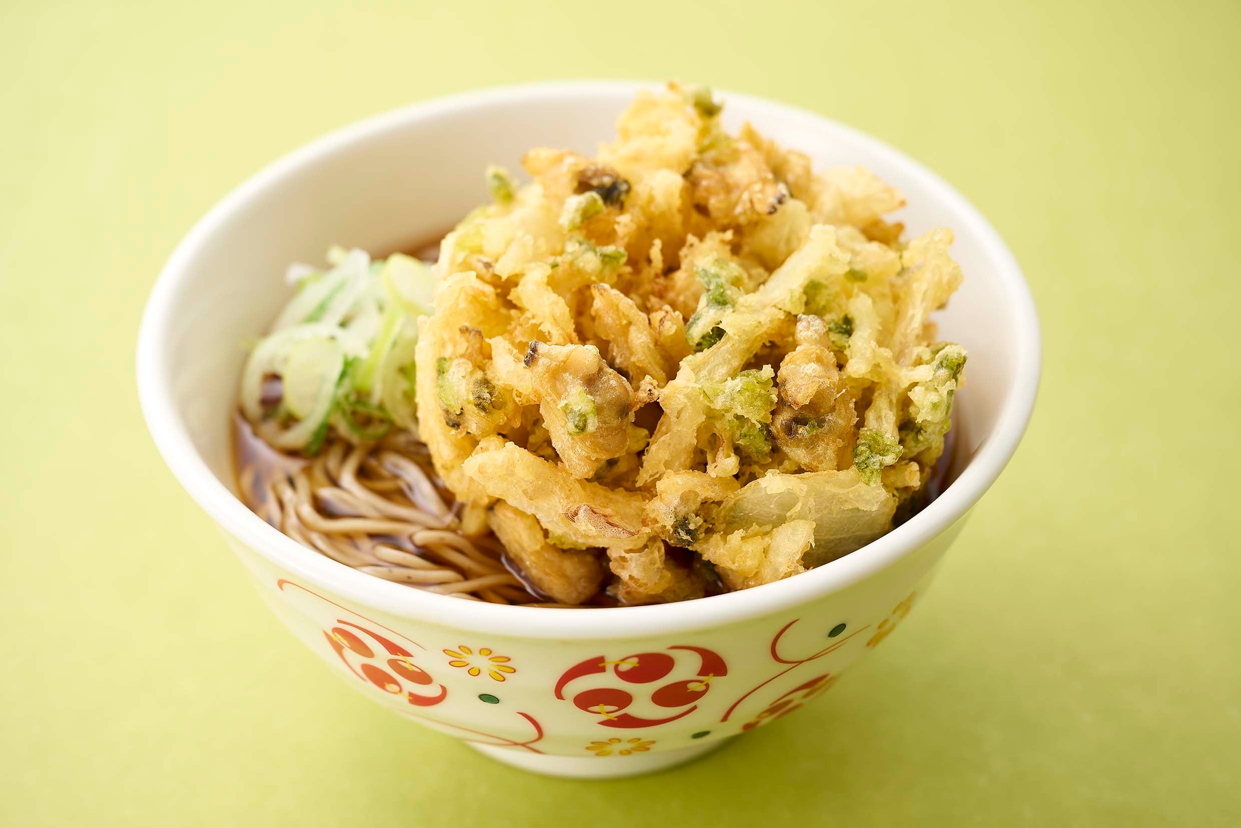 あさりの旨みと伊勢志摩産のあおさの風味あふれるかき揚げを、おそばと一緒にお楽しみいただけます。