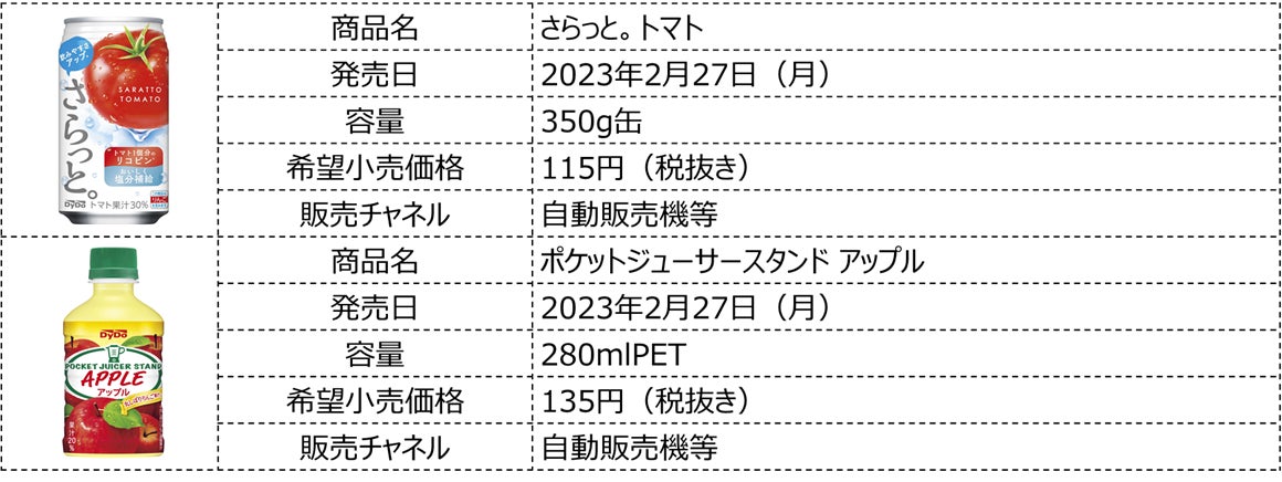 ダイドードリンコ株式会社は、2023年春夏の新商品として、「さらっと。トマト」、「ポケットジューサースタンド アップル」を2月27日(月)より発売いたします。