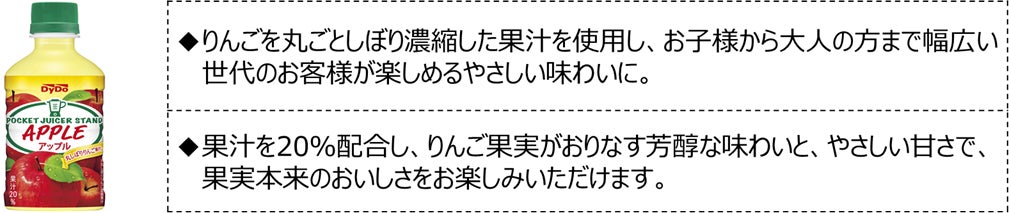 「ポケットジューサースタンド アップル」は、丸ごとしぼったりんごの濃縮果汁を使用し、やさしい甘さと芳醇な味わいで果実本来のおいしさが楽しめます。幅広い世代のお客様に親しまれる味わいです。