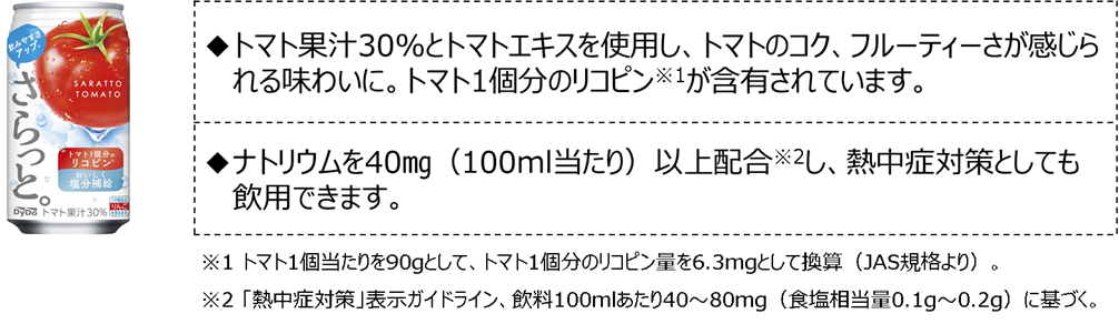「さらっと。トマト」には、トマト1個分のリコピン※1が含有、ナトリウムを40㎎(100ml当たり)以上配合※2し、熱中症対策として手軽に塩分補給ができます。フルーティーなトマトの味わいと軽快な口当たりで、よりすっきり飲みやすい味わいに仕上げました。