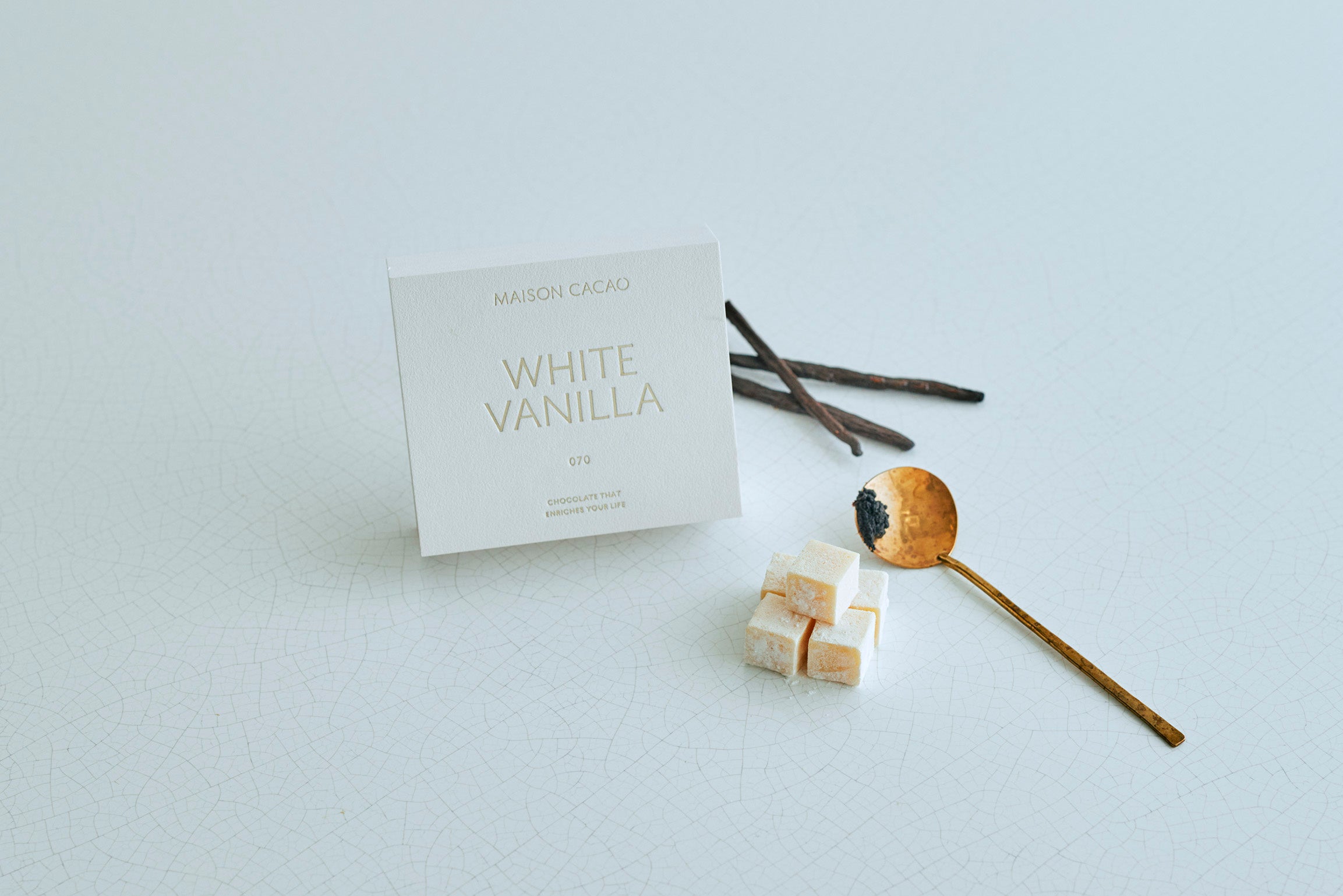 丁寧に発酵、焙煎して抽出した、カカオ本来の華やかな香りを持ち、口どけなめらかなピュアカカオバターのみを使用したホワイトチョコレートに、芳醇な香りのバニラビーンズを合わせました。とろけ出すとともに、柔らかな甘みと深い香りが広がる、ホワイトデー限定の一品です。