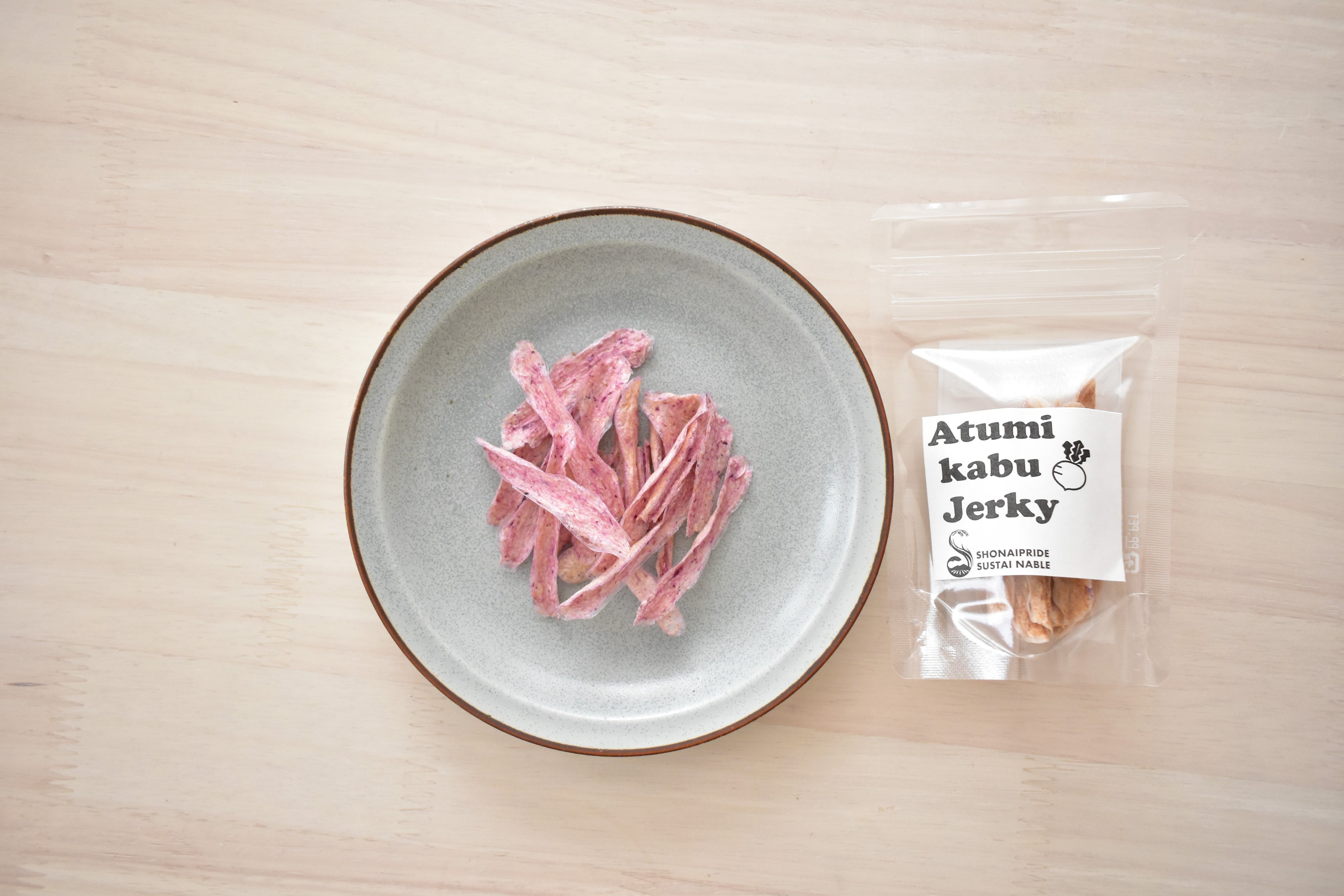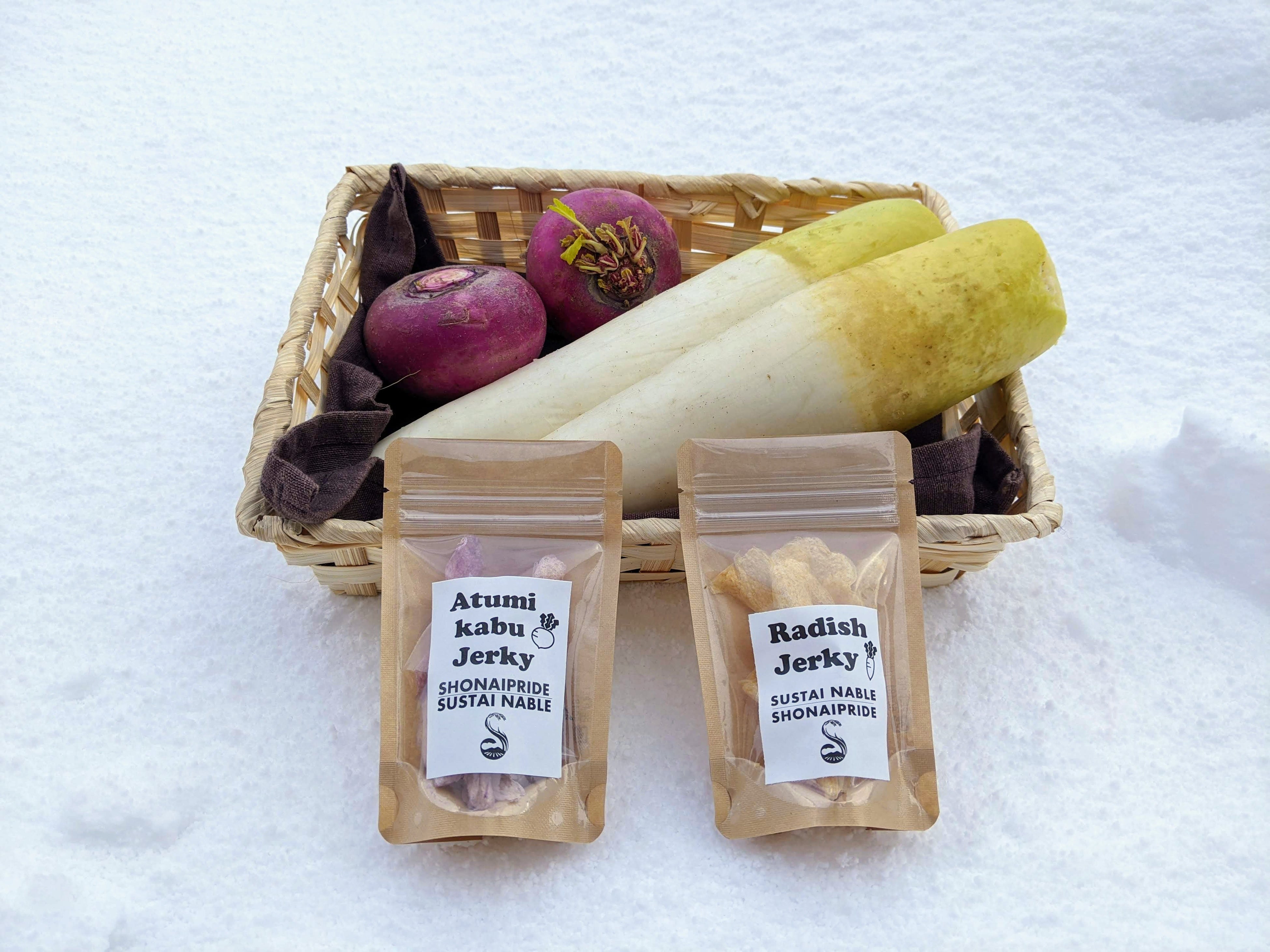 山形県庄内地方(酒田市・鶴岡市)で生産された特産の大根とあつみかぶ(赤カブ)。その中で、大きすぎたり一部が雪焼けしたりが原因で、廃棄せざるを得ない材料を使用して生まれた、ナチュラルでサステナブルな「野菜のジャーキー」です。