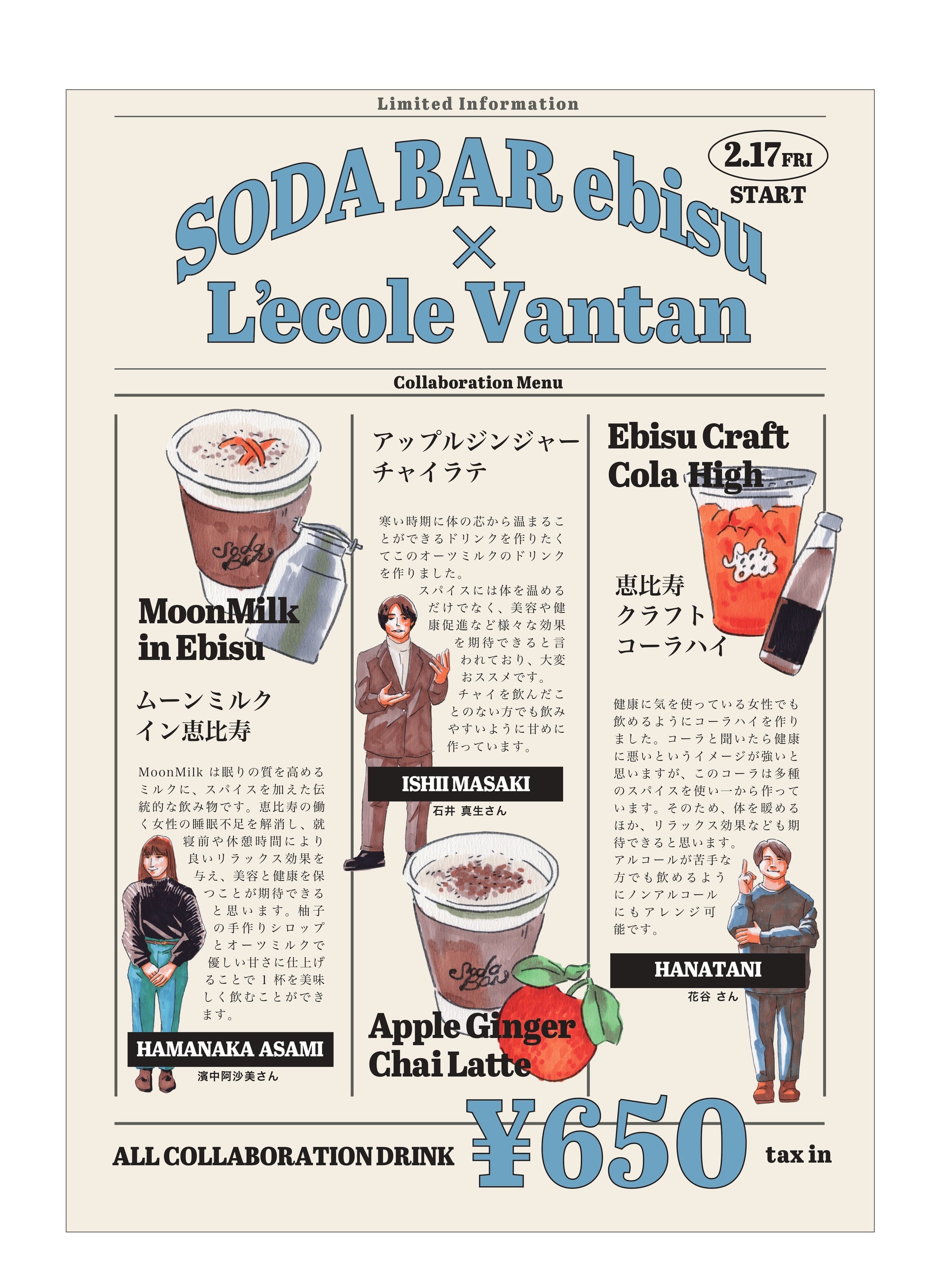 SODA BAR恵比寿店とレコールバンタン東京校は、それぞれ恵比寿という街に拠点を置き、飲食に携わっています。レコールバンタンの学生がSODA BARでアルバイトをしているご縁などもあり今回のコラボレーションが実現しました。SODA BARのコンセプトを生かしつつ、学生ならではの視点でレコールバンタンの生徒が考案したドリンクを、SODA BAR恵比寿店で販売いたします。恵比寿という街をもっと盛り上げたい、恵比寿に集まる人々に元気になってもらいたい、という想いから生まれた企画です。