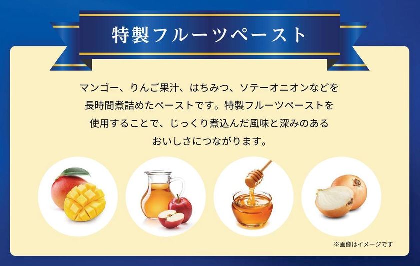 また、りんごペーストや2種類のソテーオニオンに加え、甘酸っぱさと芳醇な香りが特徴のレーズンペーストを使用することで本格的で新しい味わいに仕上げました。