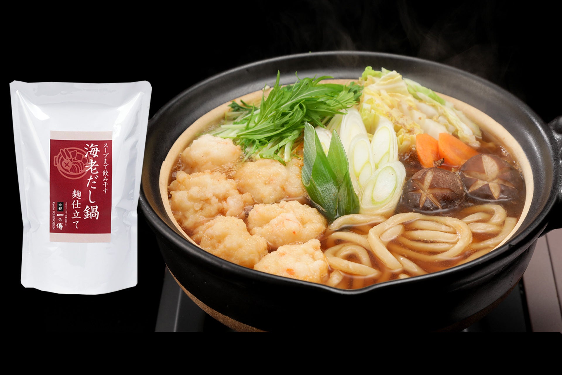 そしてこの度、新たな鍋出汁「スープまで飲み干す 海老だし鍋 麹仕立て」を販売することとなりました。甘エビを焙焼した香ばしい出汁と、玉ねぎ、にんじん、セロリをベースにした野菜出汁の旨味を合わせ、海老の風味香る鍋出汁に。麹は、西京味噌の老舗蔵元が、創業より磨いた麹づくりの技で仕込んだものを使用。まろやかな塩味の塩麹を加えることで、コク深く奥行きのある味わいをお楽しみいただけます。