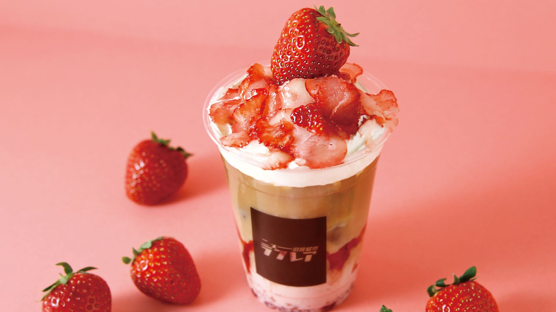 ミルクティー&イチゴミルクのまろやかな甘さがうれしいドリンクに、ホイップでフタをして、上にはたっぷりの削った苺&まるごと1個をON!