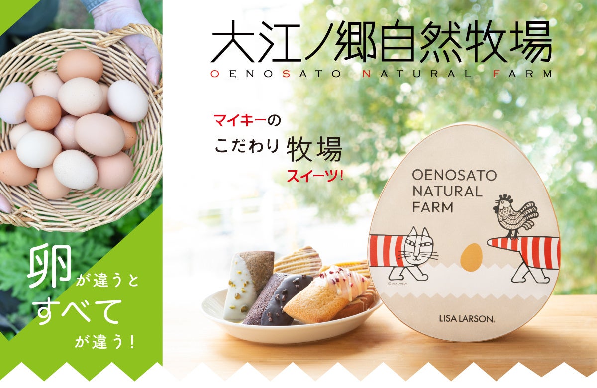 スウェーデンの陶芸家リサ・ラーソンの人気キャラクター「マイキー」と、鳥取県八頭町の「大江ノ郷自然牧場」がコラボレーション。こだわりの卵や国産素材の使用にこだわったスイーツを、牧場から直送でお届けします。