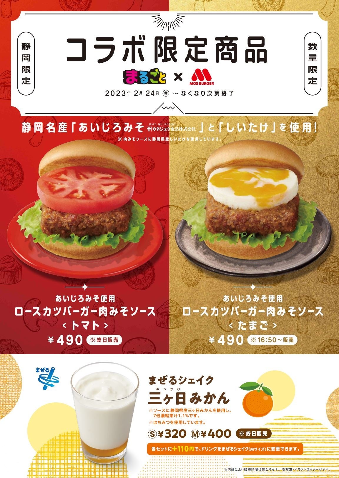 モスバーガーを展開する株式会社モスフードサービス(代表取締役社長:中村 栄輔、本社:東京都品川区)では、2023年2月24日(金)から静岡県内のモスバーガー全38店舗にて、静岡第一テレビ『まるごと』と共同開発した新商品「あいじろみそ使用 ロースカツバーガー肉みそソース<トマト>」を地域・数量限定で新発売します。また、16:50以降限定で「あいじろみそ使用 ロースカツバーガー肉みそソース<たまご>」も販売する他、2020年より毎年この時期に販売し、ご好評いただいた「まぜるシェイク 三ヶ日みかん」も復活販売します。