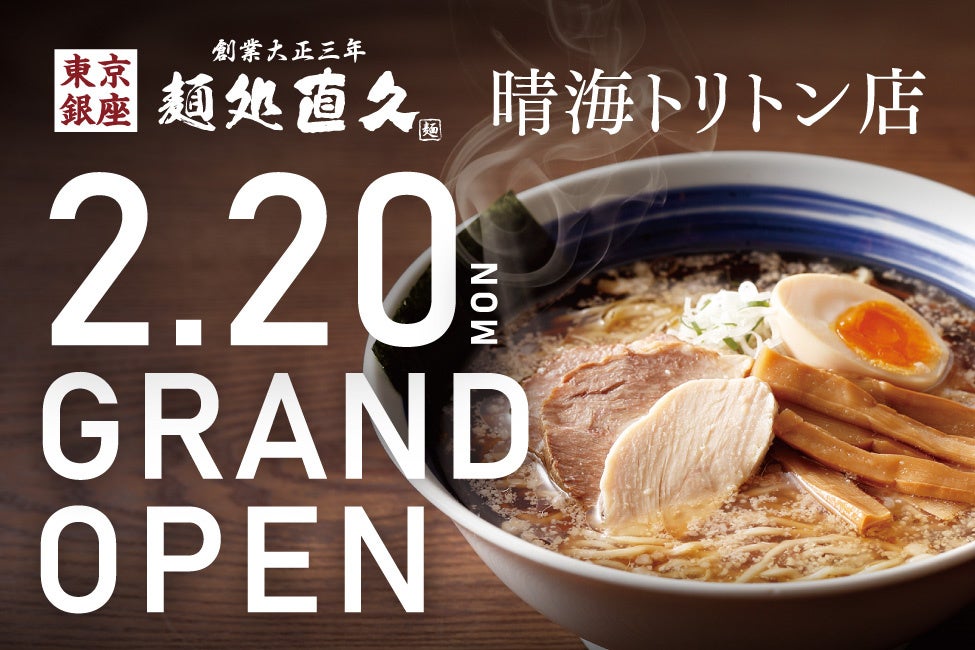 株式会社鉄人化計画グループである、株式会社直久(東京都目黒区、代表取締役社長:根来 拓也)が展開する老舗らーめん店「銀座直久」は、2023年2月20日(月)に16店舗目となる「麺処直久 晴海トリトン店」を東京・勝どきの商業施設「晴海トリトンスクエア」1階の「トリトンキッチン・フードコート内」に新規オープンします。