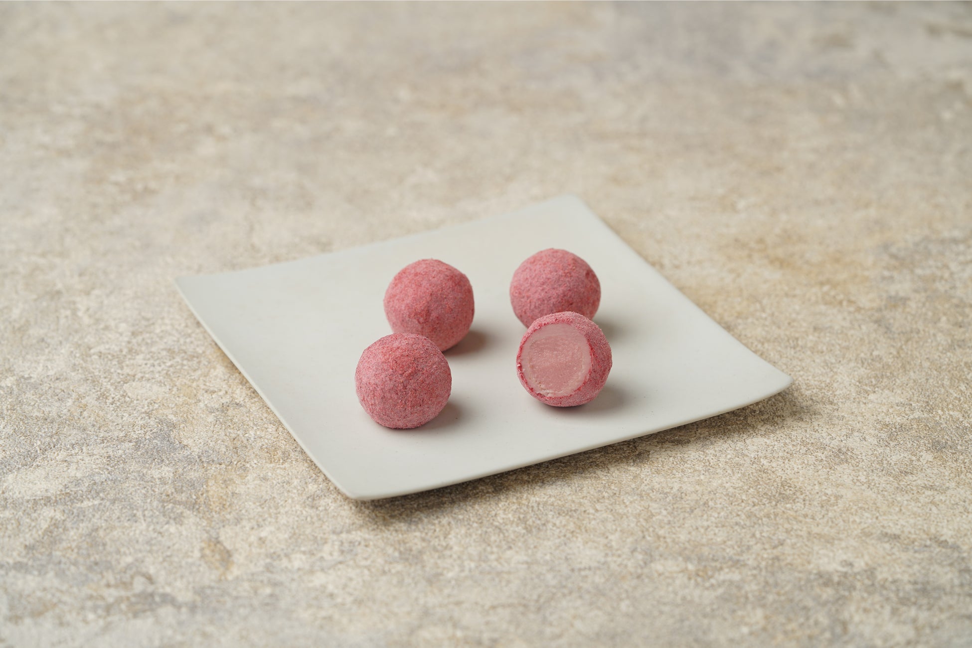 酸味が強く、甘い香りと濃厚な味わいが特徴のあまおう苺のピューレを使用した甘酸っぱいトリュフ。