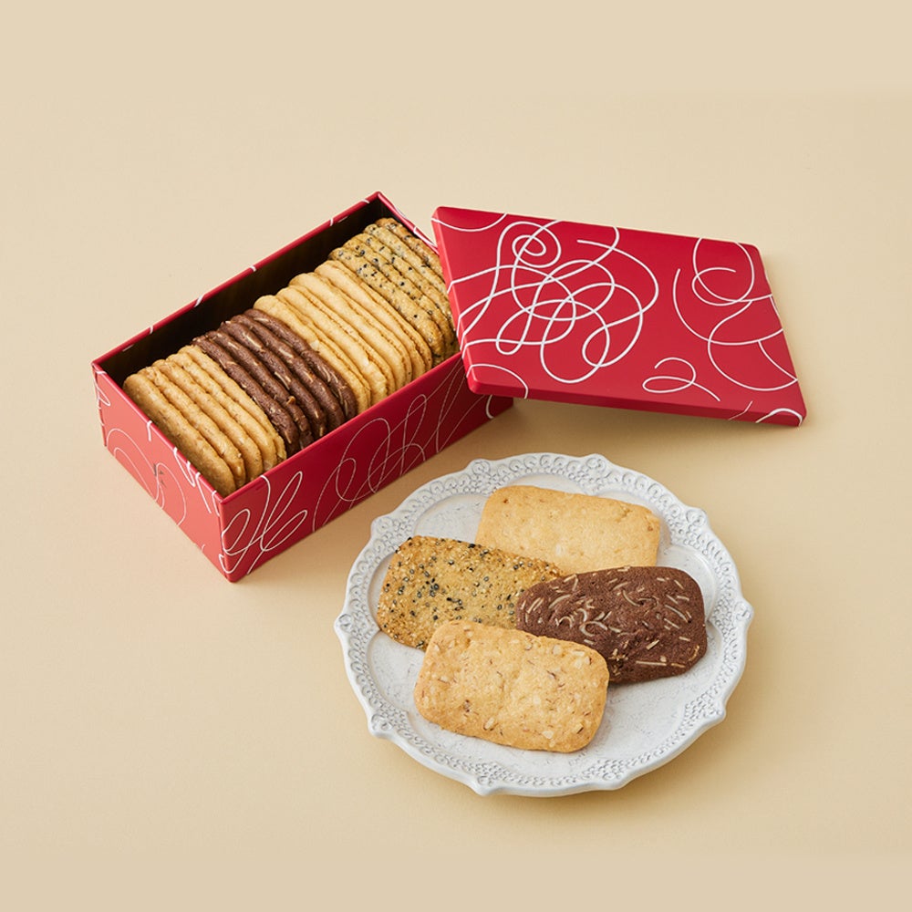 アマンド・ショコラ・マカダミア・セサミの風味豊かな4種の味が楽しめるクッキー缶です。