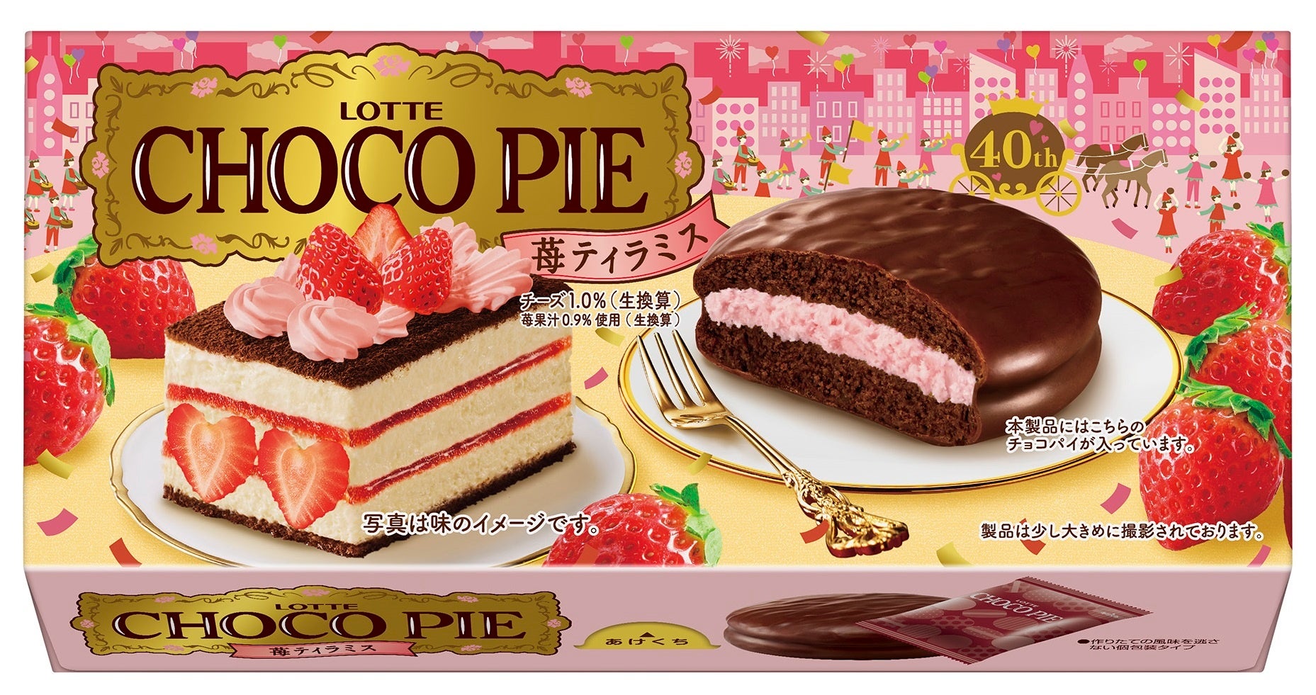 株式会社ロッテは2月28日(火)に、元気な気持ちになれる色やケーキをモチーフにした、チョコパイブランドの新シリーズ「ハピネスモチーフチョコパイ」から、「チョコパイ<苺ティラミス>」を発売します。このシリーズはチョコパイ40周年企画の第1弾として、お客様に“まぁるい幸せ”をお届けしたいという想いから誕生しました。幸せを運ぶ!?青い鳥が約17%の確率でパッケージに出現したり、ハートが散りばめられたデザインで、ハッピーを演出しています。