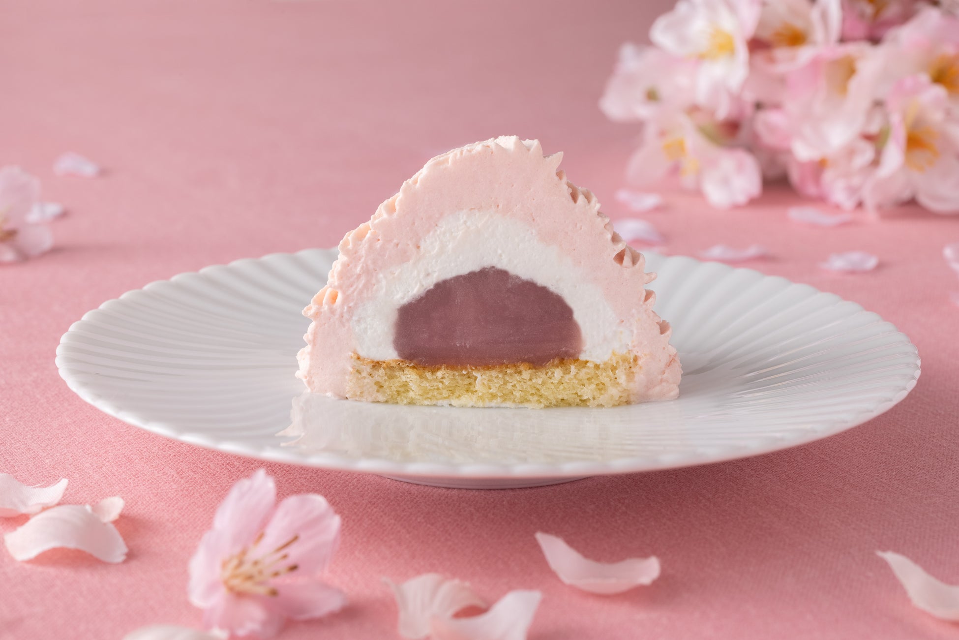 アーモンドスポンジに桜餡とシャンティクリームを重ね、桜風味のクレームディプロマットを絞ったケーキです。