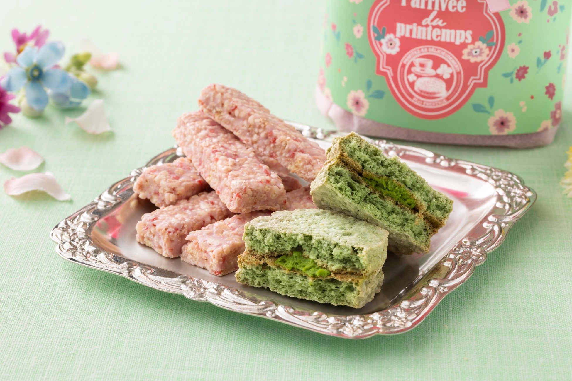 「抹茶ダックワーズ」(1個)、「ストロベリーフィアンティーヌクランチ」(5個)を詰め合わせた、春限定焼菓子のセットです。
