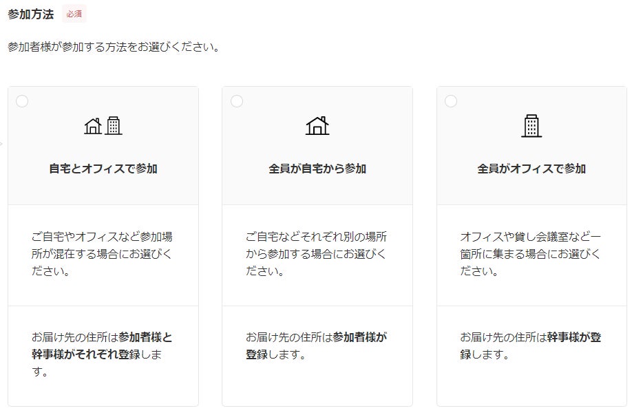 配送方法の選択機能は2022年3月にリリースし、ちょうど1年を迎えました。これを機に1年分のデータをまとめたところ「参加者が自宅とオフィスそれぞれから参加する場合」「参加者全員がオフィスや貸会議室など一か所に集まる場合」を選択した割合が直近半年で1.5倍に増える結果となりました。