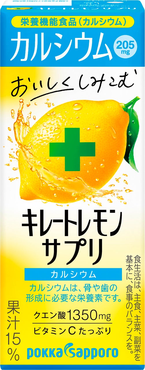 当社が続けてきたレモンの健康機能研究で分かった「キレート作用」は、レモンのクエン酸がカルシウムを溶けやすい形に変えるというもので、レモンとカルシウムを一緒に摂ることで効率よくカルシウムを補給することができます。この商品は、レモン1個分の果汁(※5)とクエン酸1350mg、そしてカルシウムが205mg入っているので、美味しく手軽にカラダに嬉しい栄養素を摂ることができます。成長期のお子様と一緒になってのカルシウム補給や、骨の健康のために摂取したい方などにおすすめです。