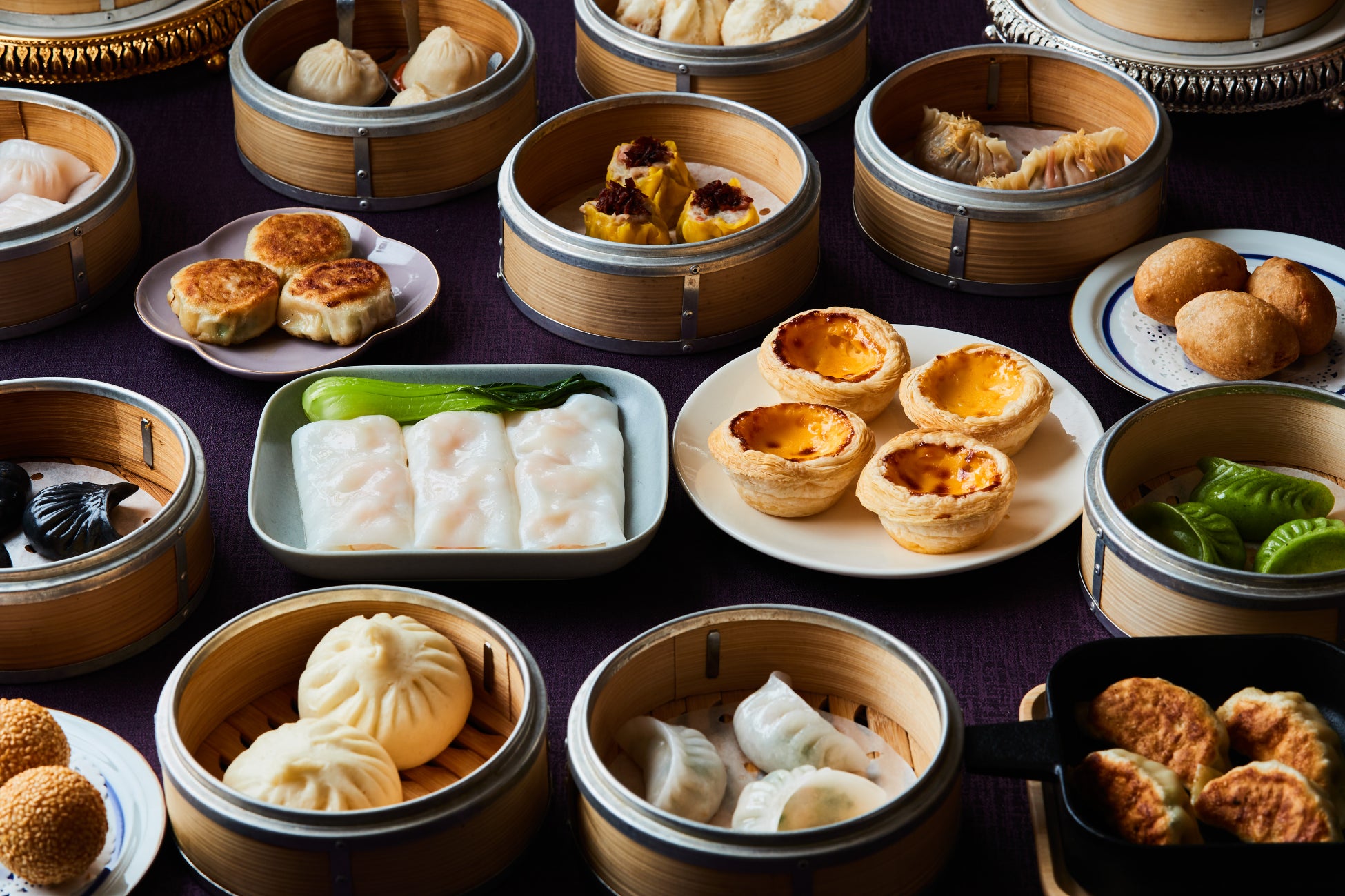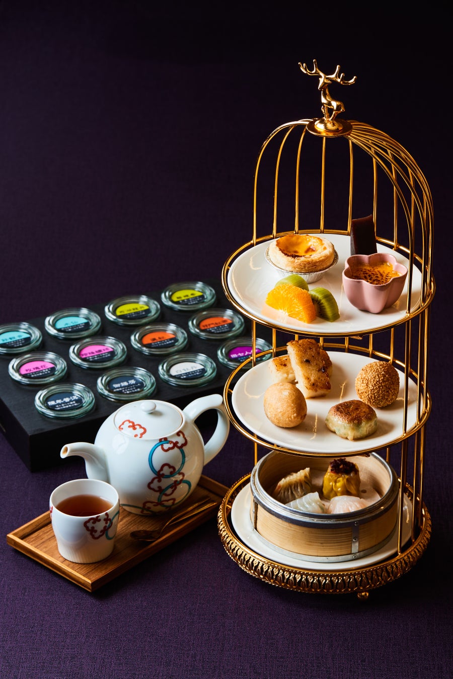 ご馳走感のある点心飲茶で作ったアフタヌーンティーセット。セイボリーには点心を、スイーツにはエッグタルトや南瓜焼きプリン等を並べました。