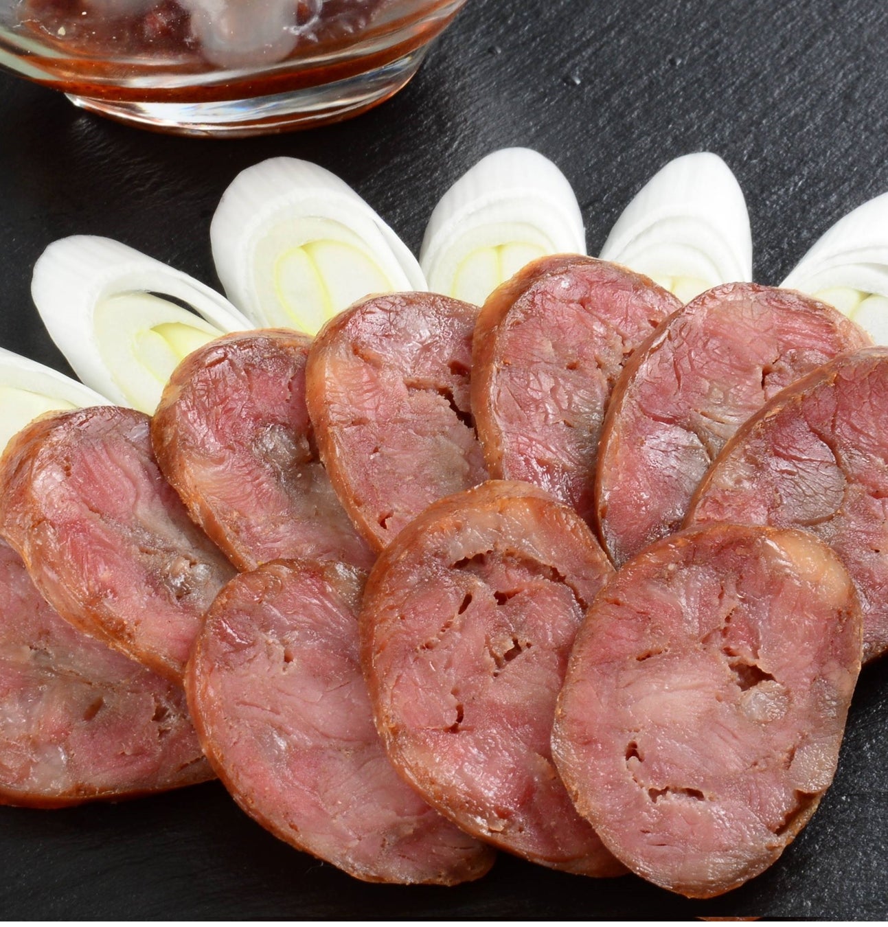 中華のシェフが手作りした中華風のソーセージ。常連さんからの人気が高い一品です。赤ワインと腸詰とスライスした白ネギを一緒にいただくのがおすすめです。