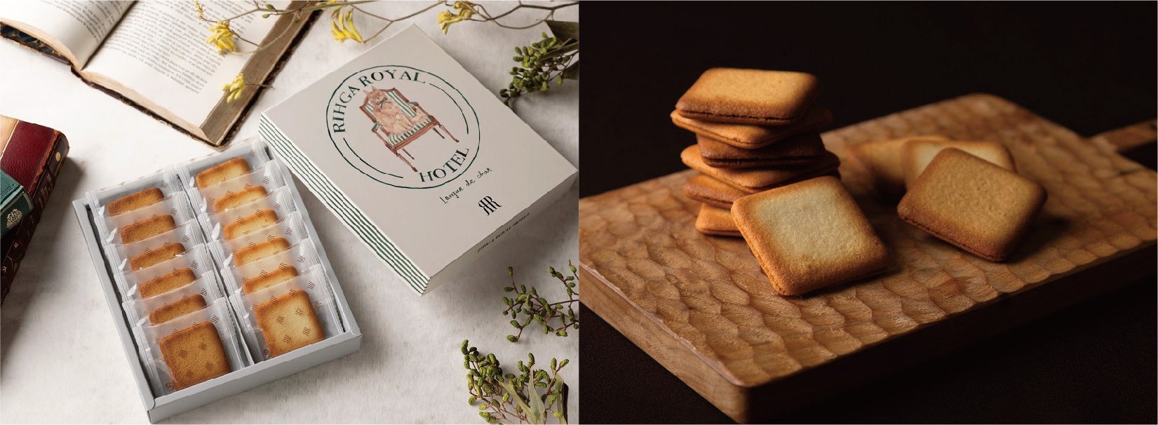 「ロイヤル ラングドシャ」は、ミルク風味のホワイトクリームと、香ばしいキャラメルクリームをサンドした2つの味が楽しめるサクッとした食感のラングドシャ。可愛らしく鮮やかな表現が魅力のイラストレーター 湯浅 望氏がパッケージをデザインしました。館内で愛用されているチェアに、舌を出した猫のイラストを軽やかに繊細なタッチで描き、ハレの日やホワイトデーギフトにもおすすめの商品です。