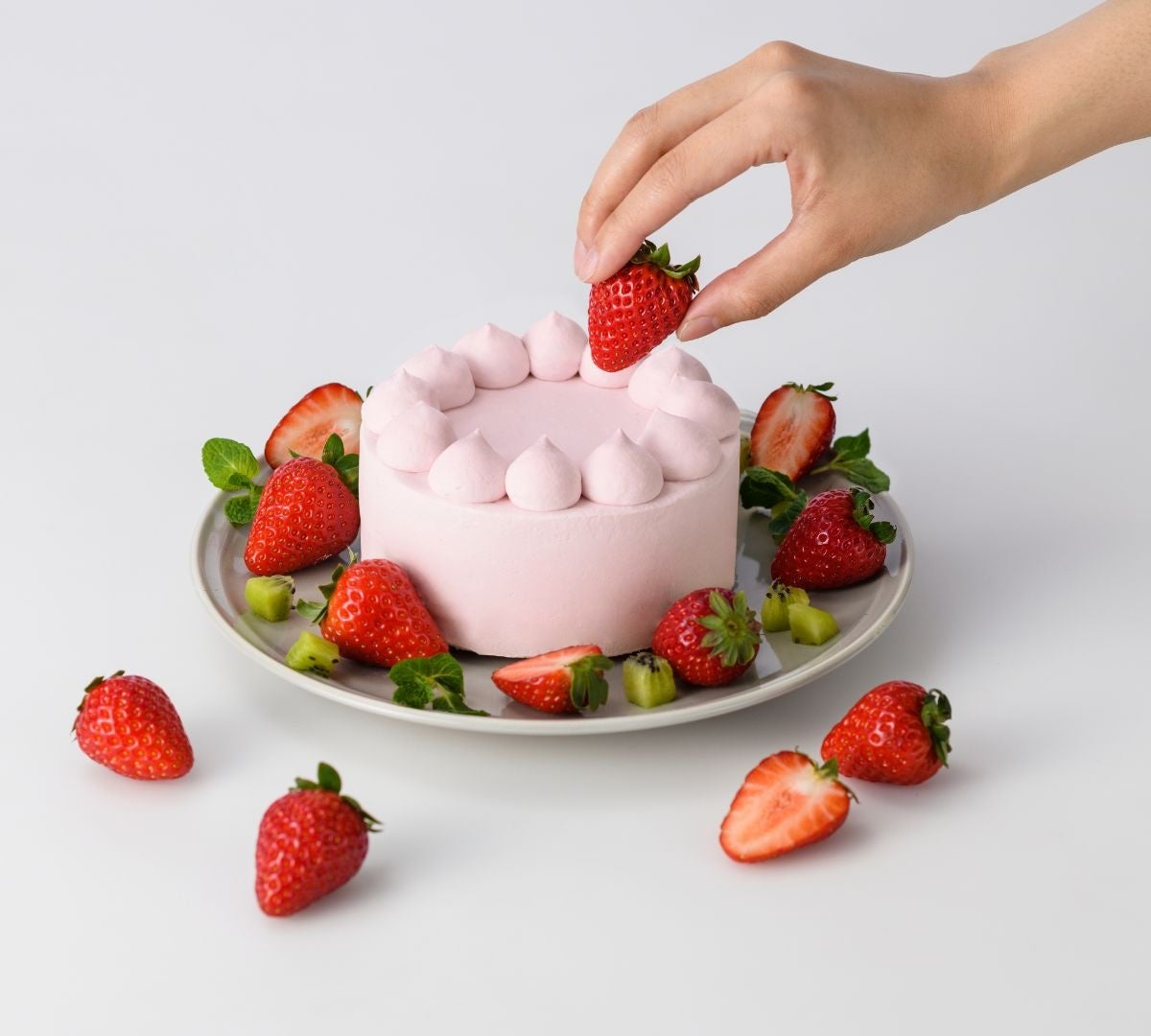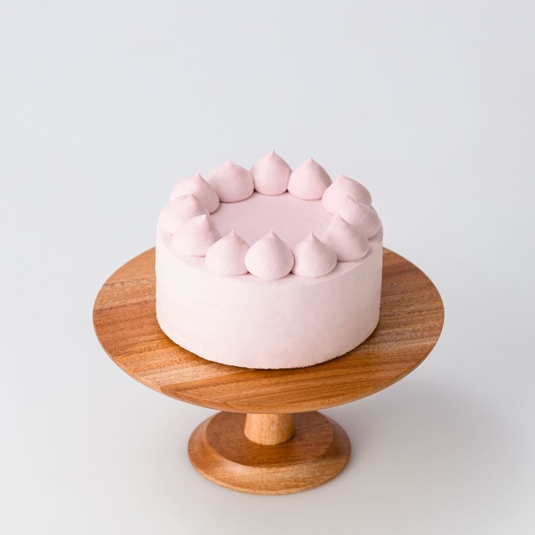 豆乳ベースのホイップにフランボワーズパウダーを加え、春らしいピンク色のクリームに仕上げてナッペをしています。仕上げは、お客様でお好みにトッピングをしていただけます。お届けは2月下旬からの発送予定です。
