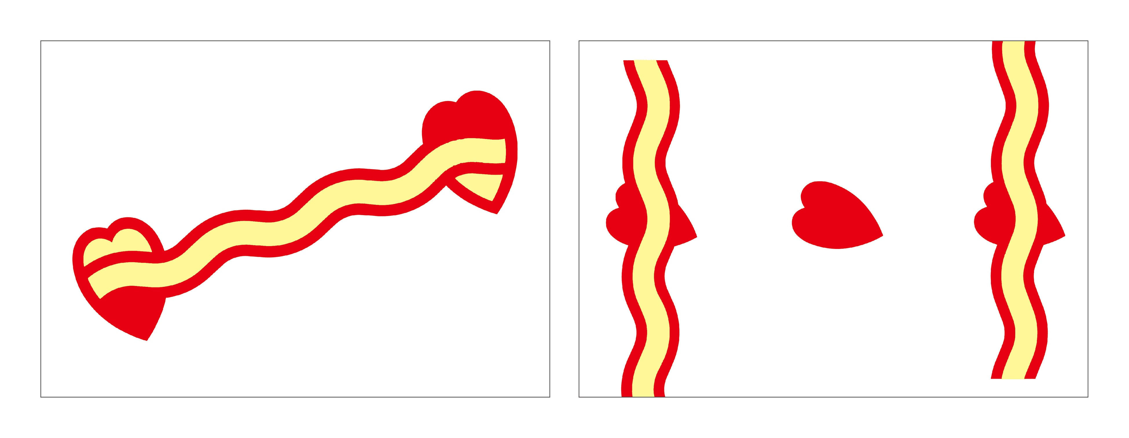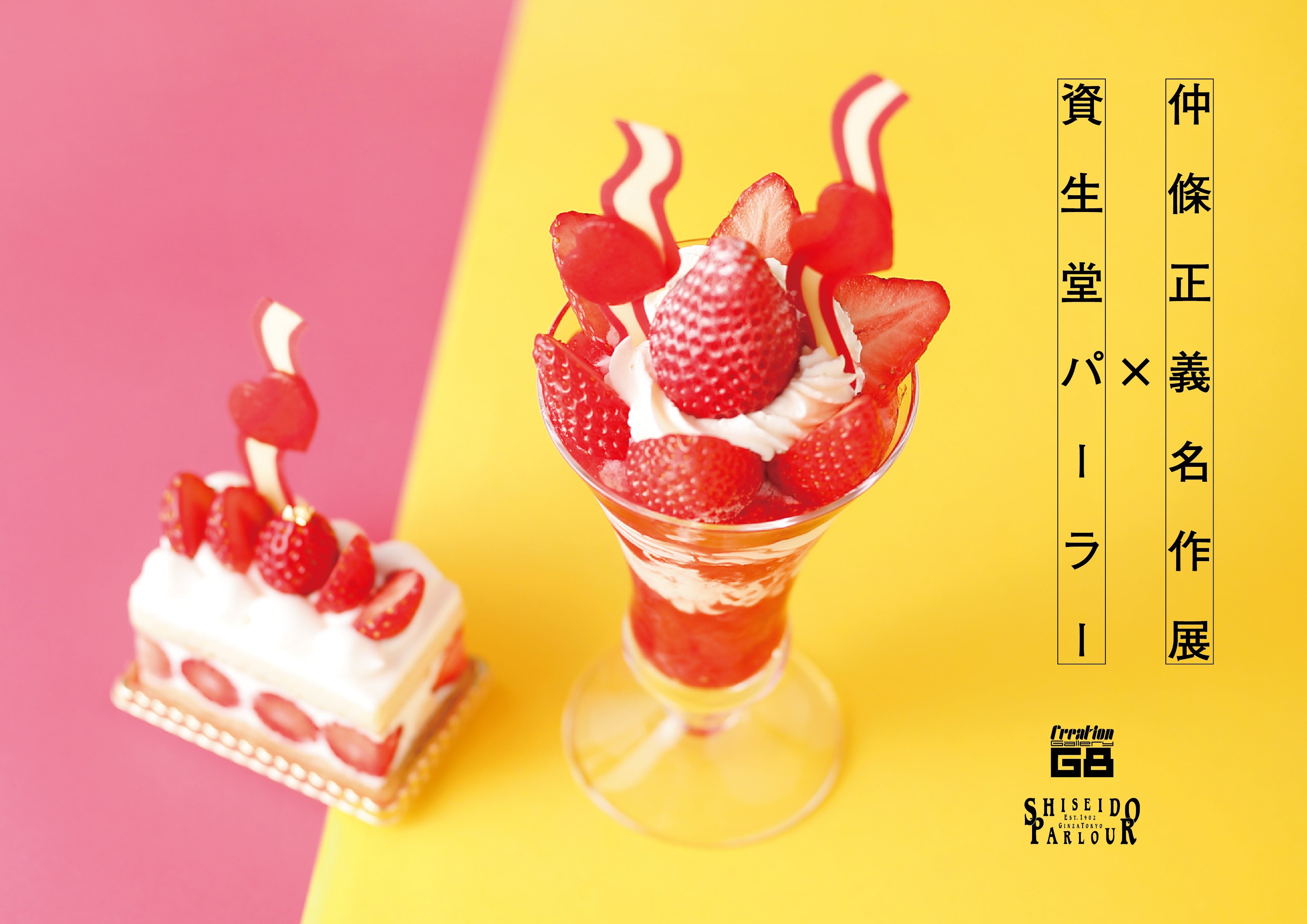 今回の作品展のポスタービジュアルの遊び心あふれるハートと波型のモチーフを資生堂パーラー人気のショートケーキやストロベリーパフェにあしらいました。心浮き立つ真っ赤なハートにハッピーなことがきっと起きそうな予感♪