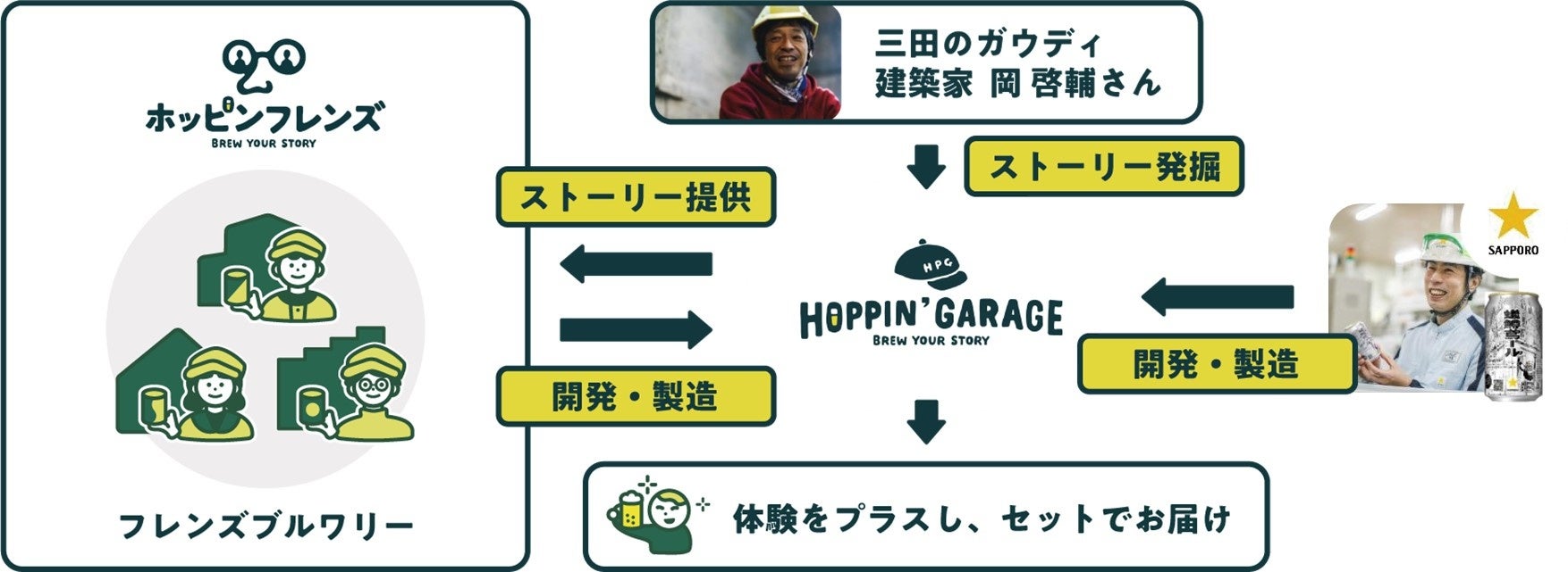 「ホッピンフレンズプロジェクト」とは、ひとつの人生ストーリーから複数の異なるビールができあがる面白さや楽しさをお客様に体験していただける仕組みです。「HOPPIN’ GARAGE」が発掘した魅力的な人生ストーリーを“ホッピンフレンズブルワリー”と称する複数の友好クラフトブルワリーに提供し、そのストーリーをもとにサッポロビールと「ホッピンフレンズブルワリー」がそれぞれ独自のビールを開発、製造します。それらのビールは、「ホッピンフレンズセット」として「HOPPIN’ GARAGE」公式サイトで販売します。この「ホッピンフレンズプロジェクト」では、お客様に主人公の人生ストーリーを様々な角度から味わえる体験や、ブルワーごとの表現の違いを飲み比べる楽しさを提供していきます。また、本プロジェクトは、「ビールを通じた人やストーリーとの出会い」というビールの新しい価値を提唱し拡げる取り組みであり、かつビールづくりに向き合うブルワー一人ひとりの表現力にスポットを当てた取り組みであることから、ビール業界全体の活性化にもつながると考えています。