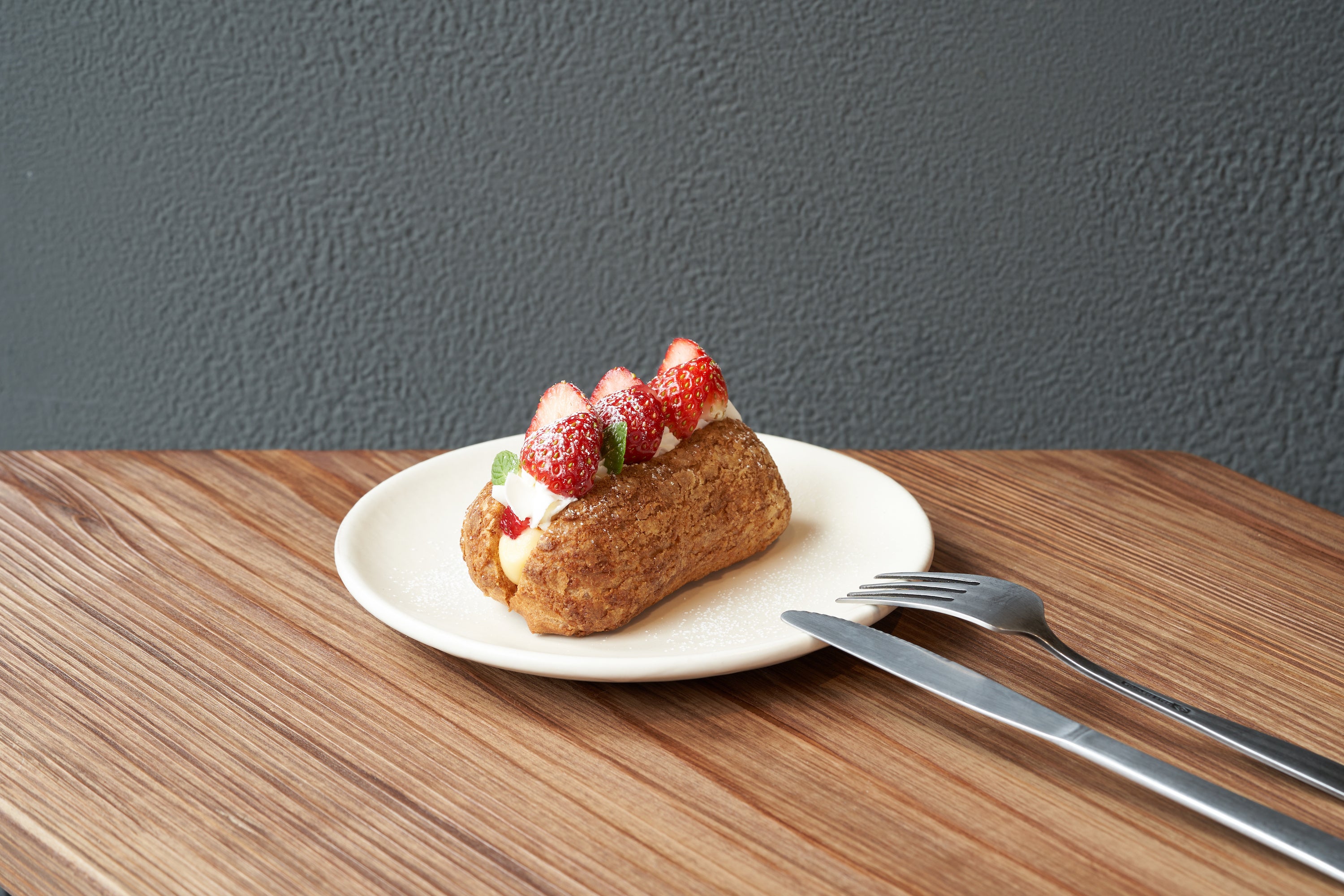 自家製のクッキーシューにカスタードクリームとホイップクリーム、カットした苺をたっぷり入れ、贅沢に苺をトッピングした見た目も可愛いシュークリームです。