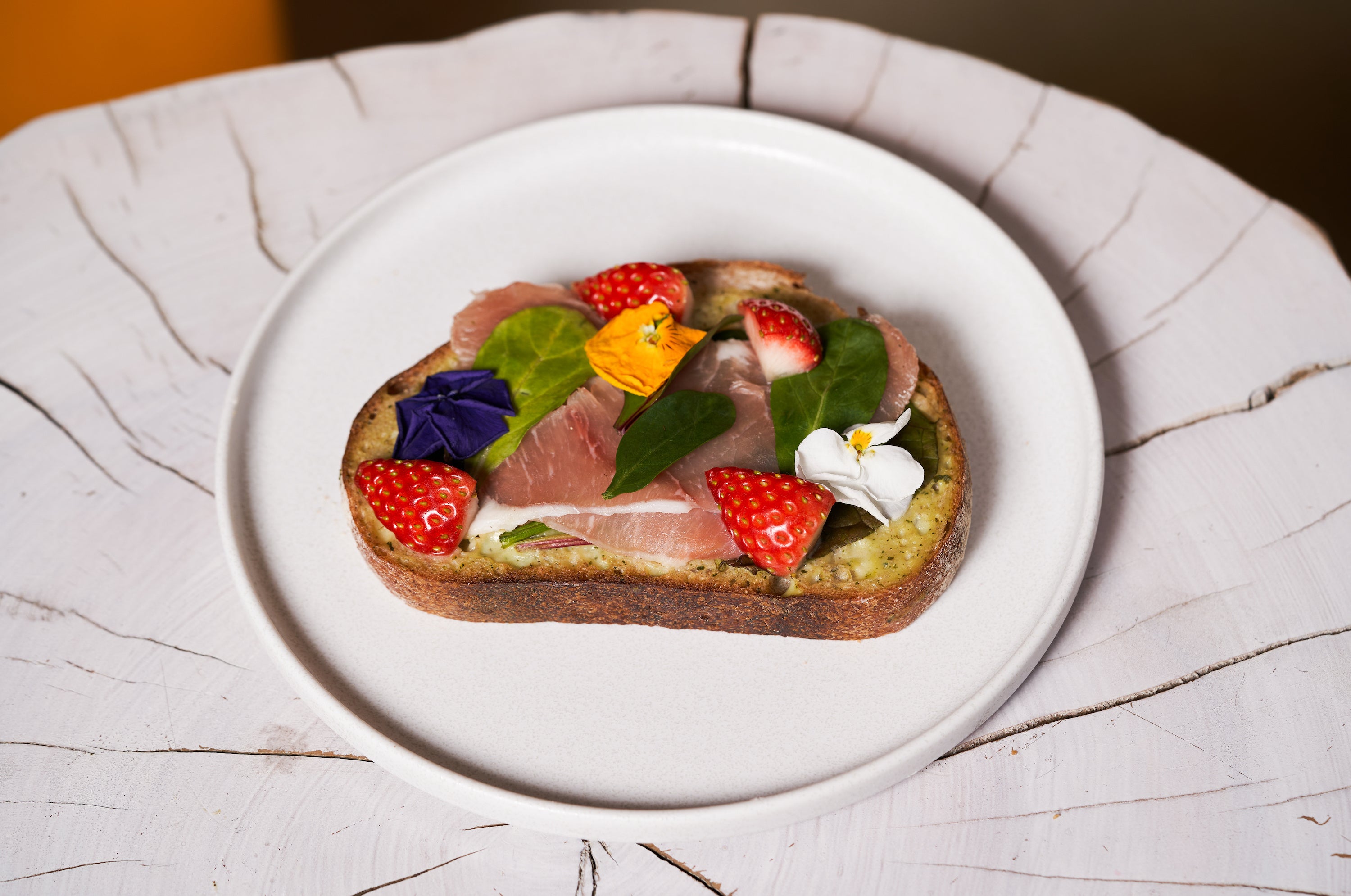 カンパーニュにバジルホワイトソースを塗り、いちご、生ハム、ベビーリーフ、エディブルフラワーをトッピングしました。