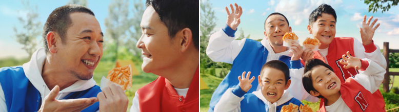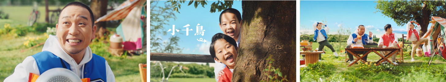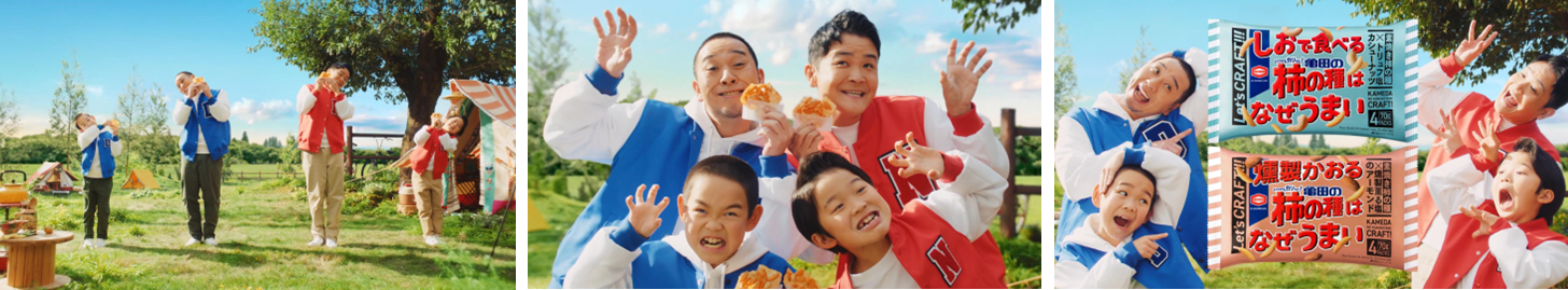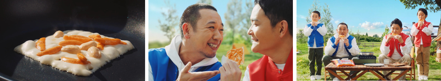 千鳥と、本人にそっくりな小千鳥が、テントの近くで「亀田の柿の種」を持って、なにか作ろうとする様子から始まる今回のCM。フライパンで加熱して、ふつふつとしたスライスチーズの上にパラパラと「亀田の柿の種」をかけて出来上がった「柿の種チーズせんべい」。大悟さんがノブさんへ「どうぞぅ」と勧めると、そのおいしさに「カリッとうまし!」と感動する4人。思わず試してみたくなる、シズル感たっぷりなCMカットが印象的です。