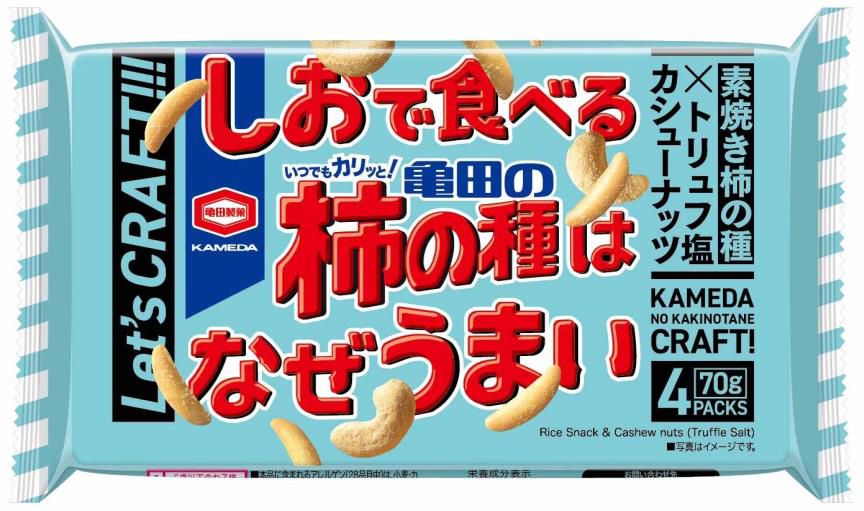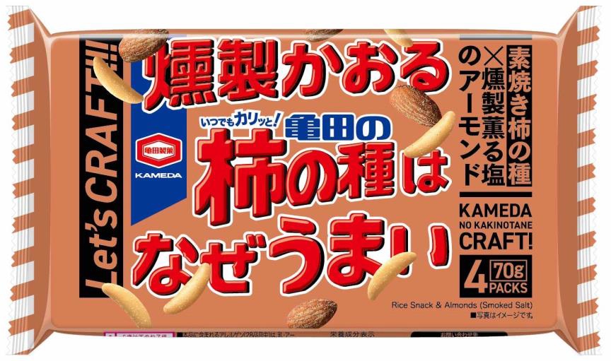 新商品『70g しおで食べる亀田の柿の種はなぜうまい 4袋詰』『70g 燻製かおる亀田の柿の種はなぜうまい 4袋詰』は、これまで亀田製菓社員しか知らなかった「素焼き柿の種」を濃厚な味わいのナッツとともに楽しむ、新しい食べ方の提案です。ナッツの味わいと、素焼きによって引き立つ柿の種のお米の甘みが、カリッと軽い食感と共に口の中でMIXされることで、最後まで飽きずにお楽しみいただけます。新発想の亀田の柿の種をお楽しみください。