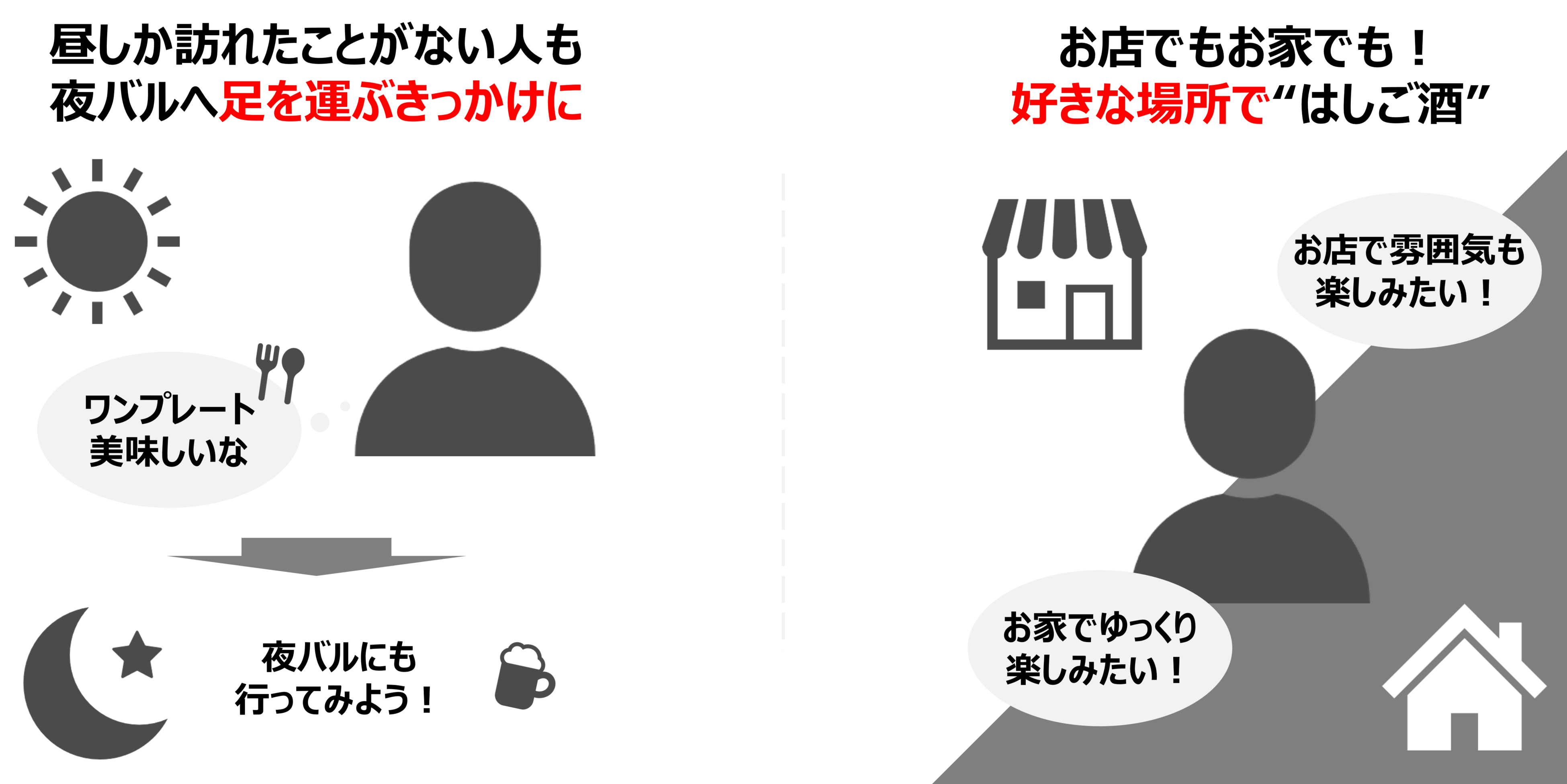 コロナ禍によって誕生した新しいライフスタイルは、特に外食シーンに大きな影響を与えています。行動規制も解除され気兼ねなく食事ができつつある一方で、一つの料理をシェアすることや大勢で集まること、お店側の衛生環境などの“不安”という新しい価値観も生まれており、外食産業は未だコロナ前の水準に戻っていないのが現状です※。そんな新しい価値観にも適応した、オンライン(フードデリバリー)とオフライン(イートイン・テイクアウト)が融合するグルメイベントを開催することで、地元の魅力を再発見してほしいという想いから「上新庄グルメとはしご酒」を開催する運びとなりました。