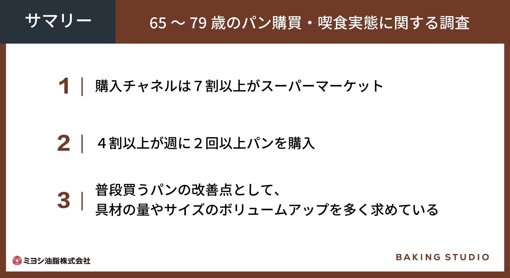 ミヨシ油脂株式会社(本社:東京都葛飾区、代表取締役社長兼CEO:三木逸郎)は、全国に居住する65~79歳の525名を対象に、パン購買・喫食実態に関する調査を2022年9月23~27日に実施。本調査結果を新事業・商品開発に役立つ情報を発信するWebサイト「ミヨシ未来プラットフォーム」で2023年2月21日から公開しました。65~79歳のパンに関する嗜好や好まれるパンの実態を明らかにするとともに、調査結果を踏まえたミヨシ油脂オリジナルレシピを紹介、専用フォームからダウンロードもできます。https://mmp.miyoshi-yushi.co.jp/baking-studio-post/trend_labo_2301