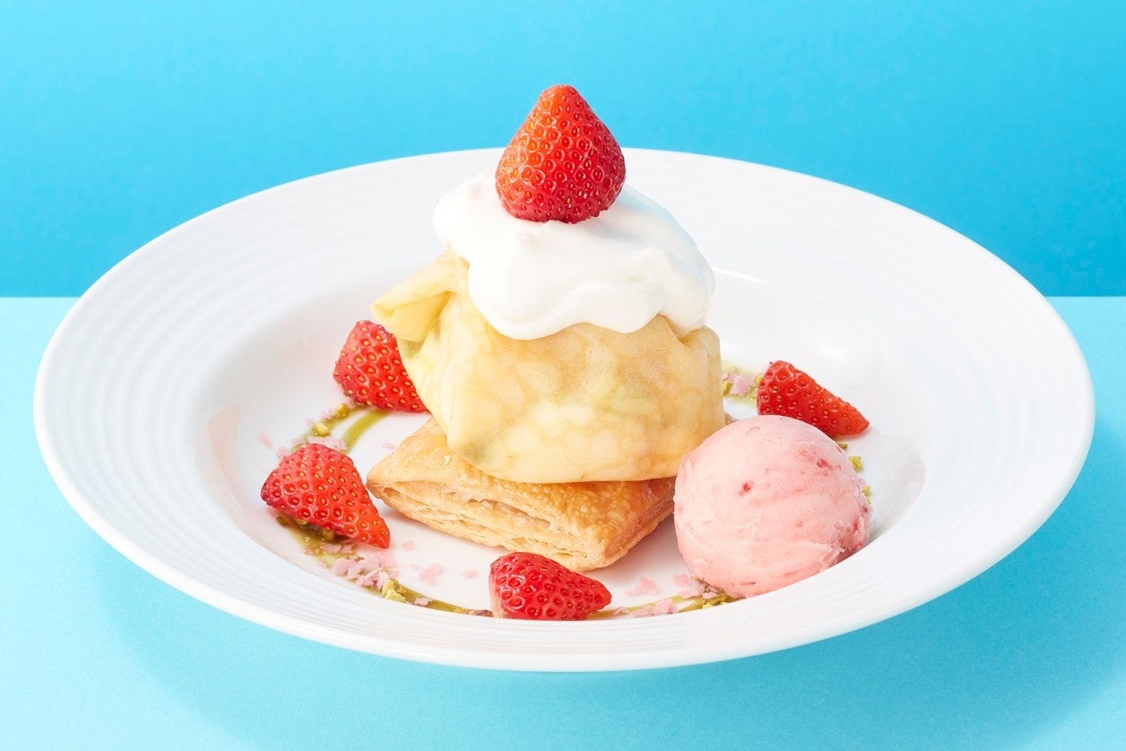 ココスオリジナルの「CoCoプリン」といちごをもちもちクレープで包み、さくさくパイをあわせた食べ応え抜群の一品です。周りにトッピングしたいちごとピスタチオソース、ピンクフレークが春らしさを演出します。上からとろっとかけたふわとろホイップ、プレートに添えたいちごシャーベットとご一緒にお楽しみください。