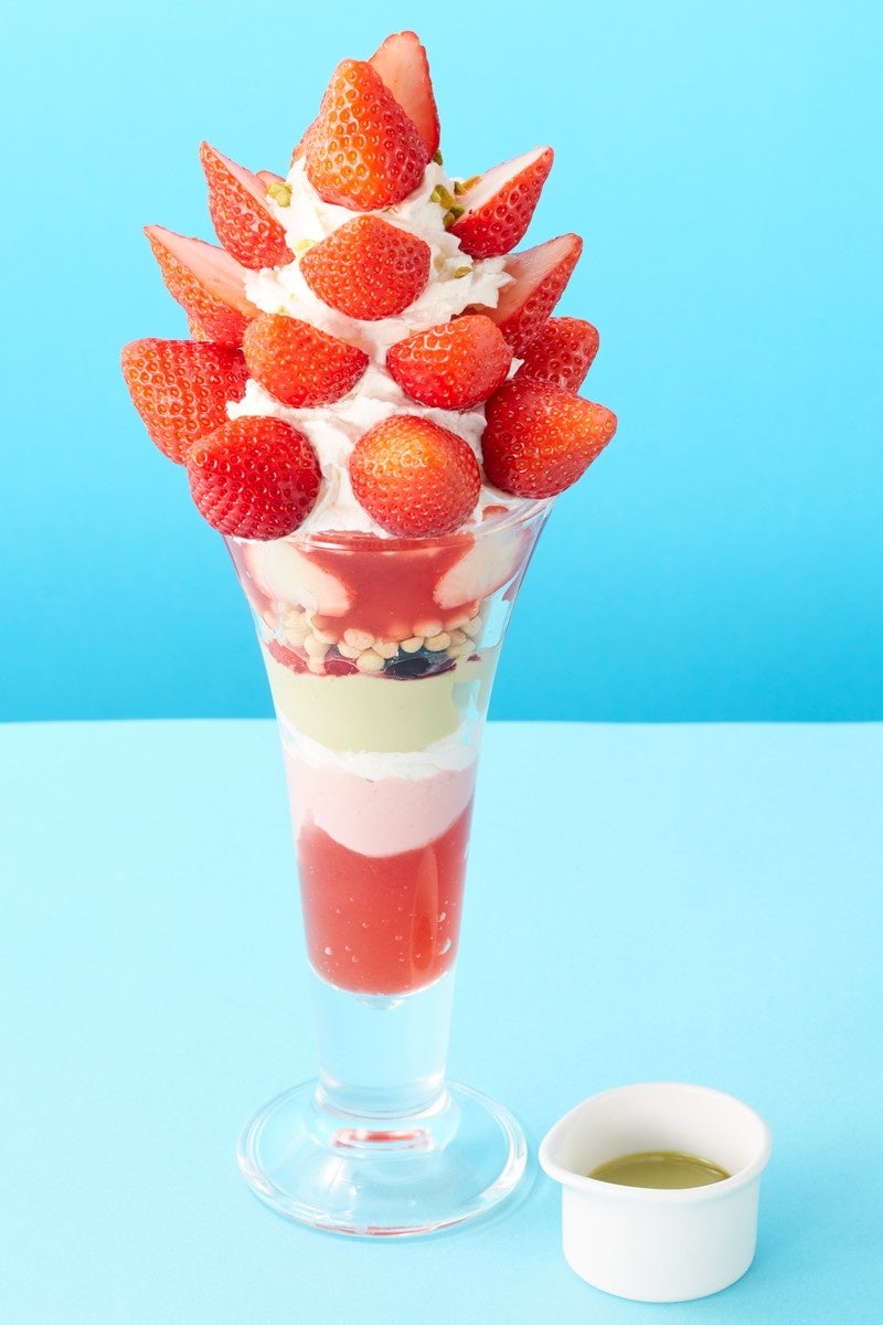 「超いちご!15(いちご)とピスタチオのクイーンパフェ」は国産いちごを15粒分使用し、いちごをまるごと頬張る“口福(幸福)”をテーマにした一品です。程よい酸味のいちごゼリー、果肉入りのいちごシャーベット、さらに、ホワイトチョコがまろやかなコクを引き出すいちごホワイトチョコプリンなど、いちごを心ゆくまでご堪能いただけます。甘酸っぱいいちごを引き立てるのは、クラッシュした実を入れたピスタチオアイスやピスタチオプリンです。別添えのピスタチオソースで“追いピスタチオ”をすると一層濃厚な風味をお楽しみいただけます。