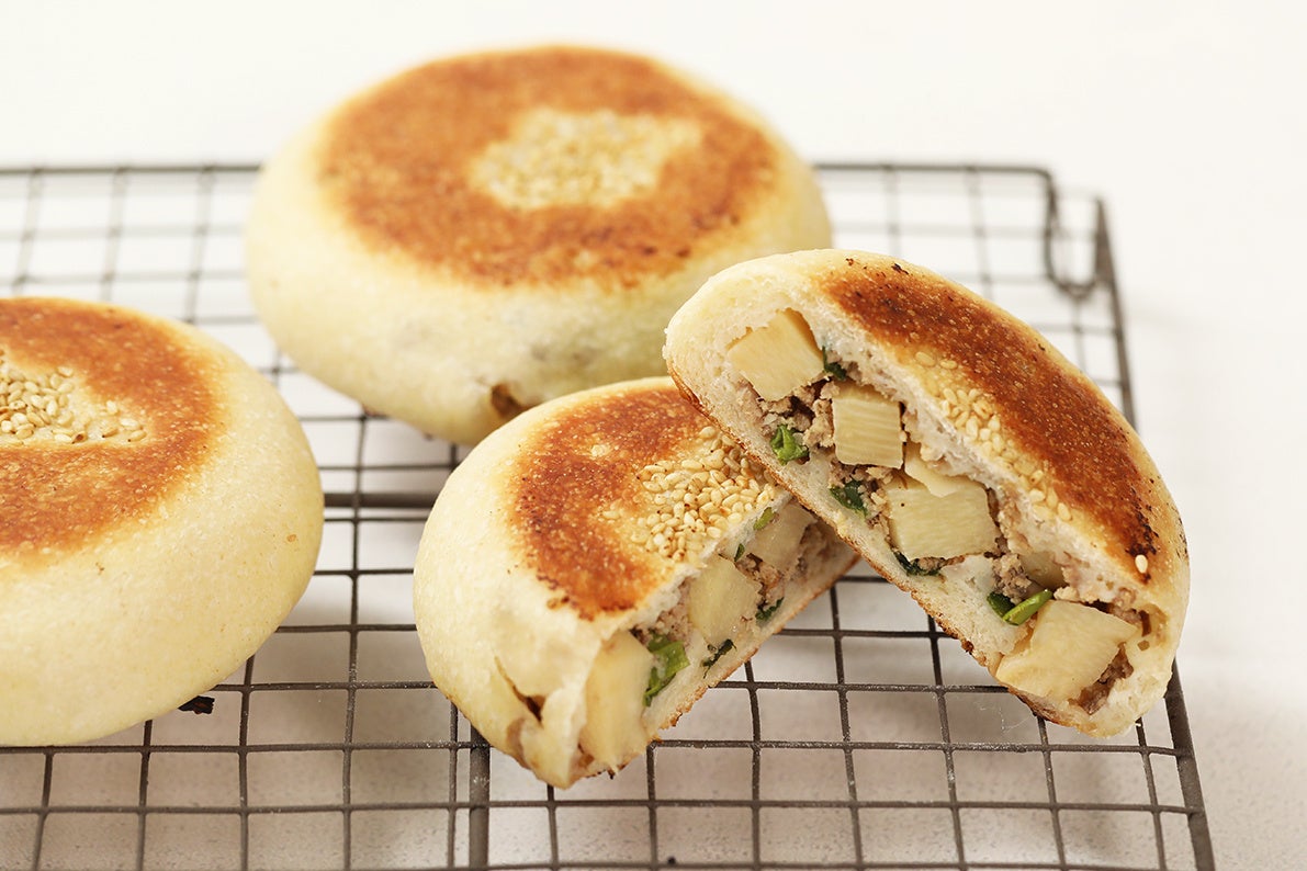春が旬の竹の子、ひき肉、ねぎを合わせた手作りの具材を醤油で絡め、バゲットラビットの人気商品『ブール』の生地で包みました。香ばしくもっちりとした生地やごろっと入った竹の子の食感が楽しい春限定のおやきです。