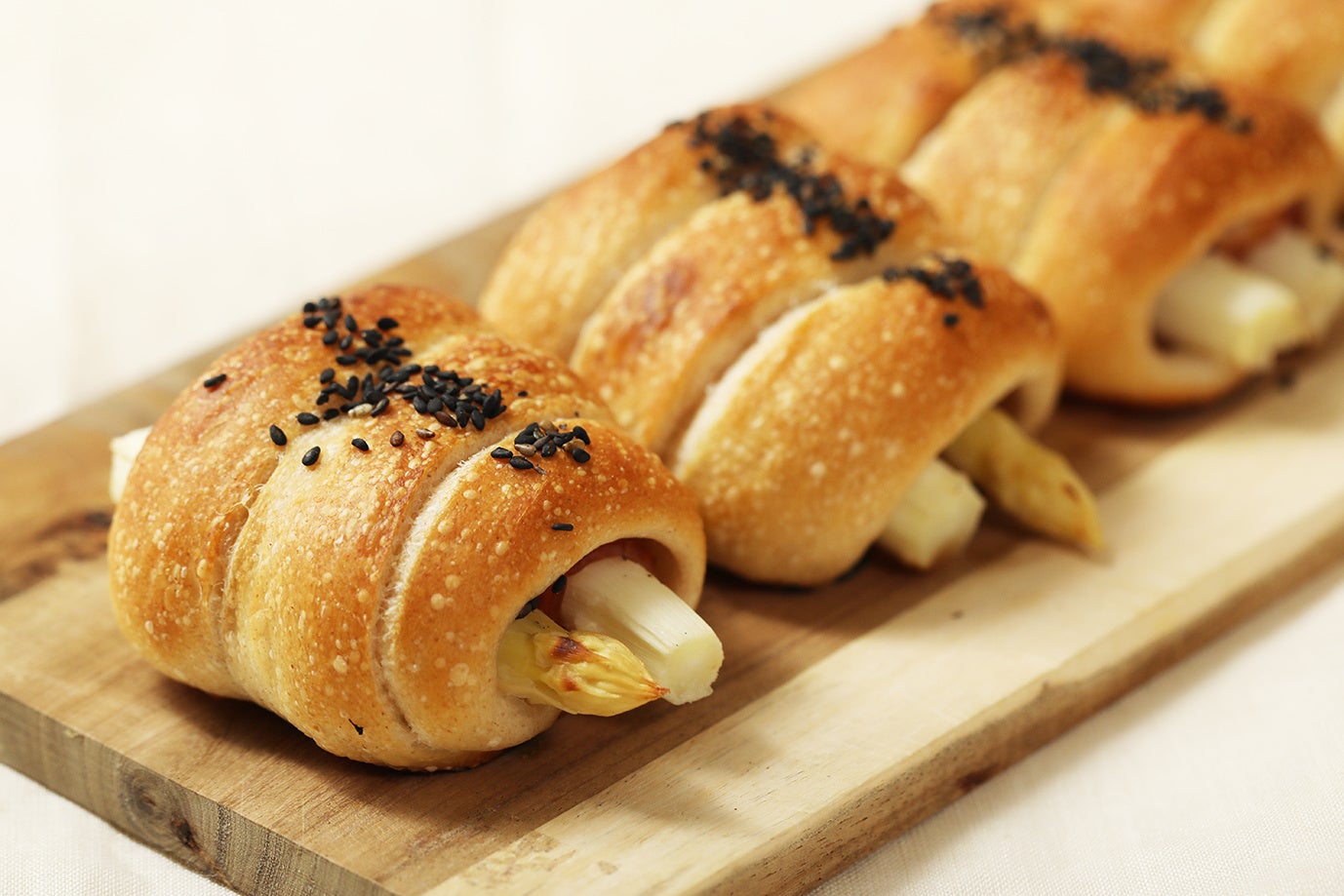 もっちりとしたフランス生地でホワイトアスパラとベーコンを包みました。ホワイトアスパラのシャキッとした食感と甘み、ジューシーなベーコンがマッチした食欲そそる味わい。食べやすいサイズのプチパンで、行楽にもぴったりです。