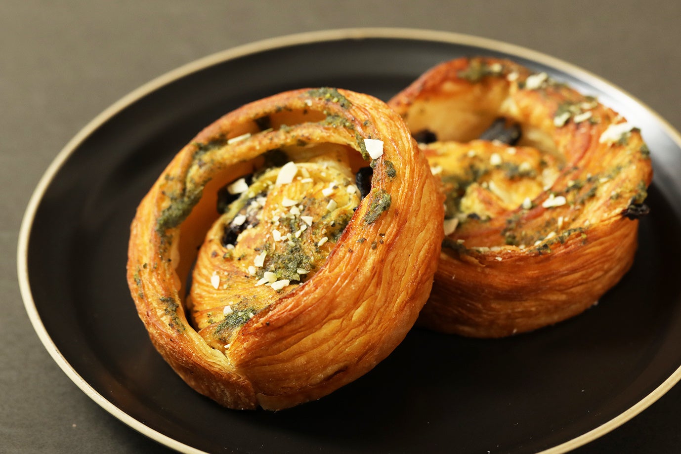 発酵バターが効いたデニッシュ生地にガーリックバターとエスカルゴをのせ、巻いて焼き上げました。
