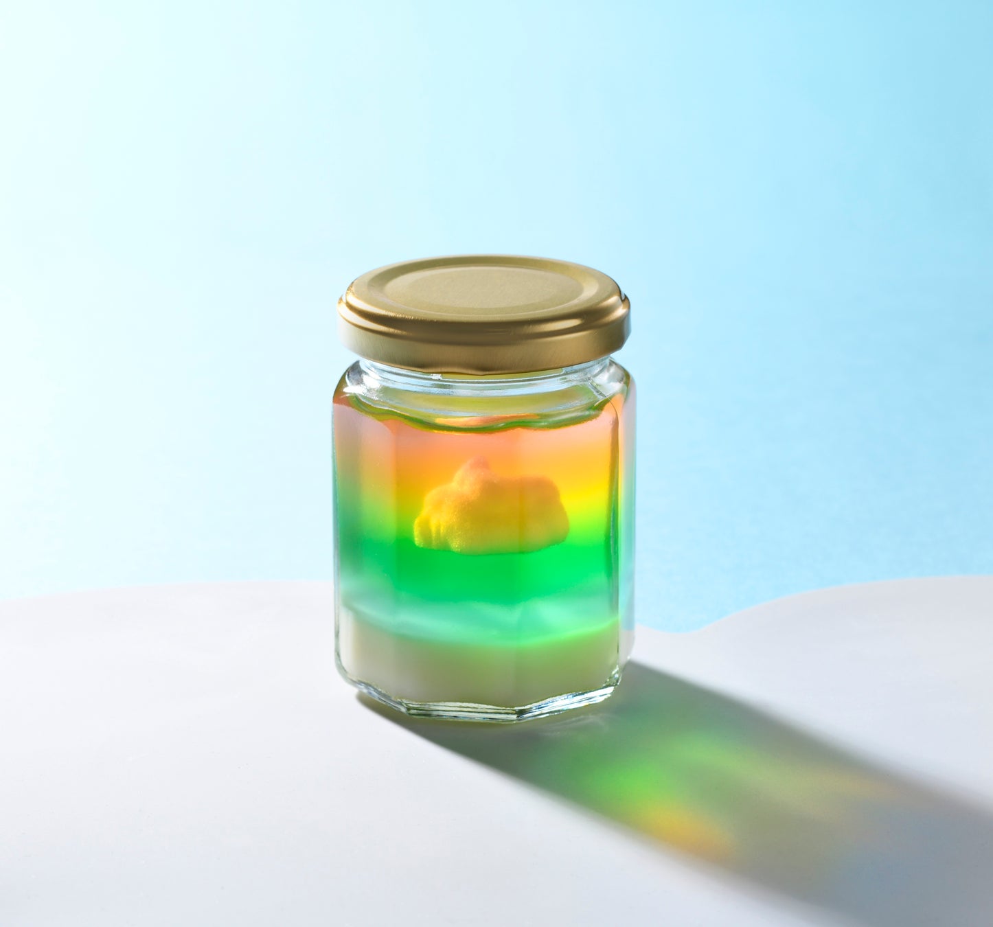 甘酸っぱいフルーツの美味しさで仕上げた錦玉羹を、雲に見立てたミルク味の淡雪と一緒に、瓶に閉じ込めました。そのままスプーンでお召しあがりください。