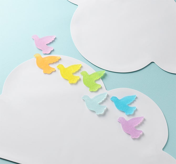 空にかかる美しい虹を、七色の鳩形の錦玉で表現しました。その姿はまるで、彩り豊かな未来へ飛び立つよう。