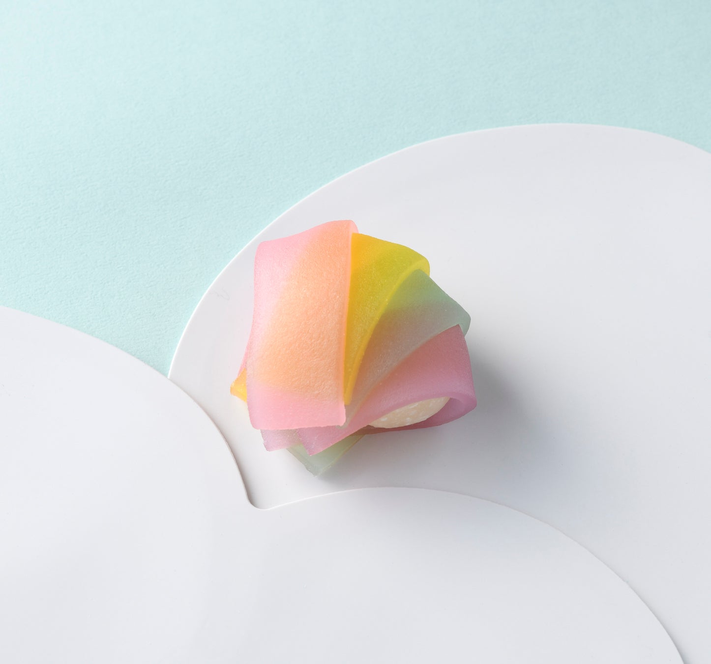 優しい甘さの餡を白い雲に見立てた求肥で一包み。雲の上に壮大に架かる虹を帯状に重ねた羊羹で“なないろ”に見立てました。