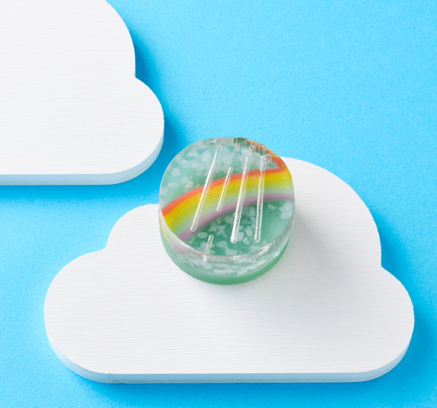 空に見立てた錦玉羹に、道明寺で雲を、そして色鮮やかに重ねたこなし生地で雨上がりの虹を表しました。目にも清々しいお菓子です。