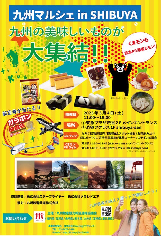 日本最大級の地方局出身アナウンサー団体「女子アナ47」を運営する株式会社Cheering(本社:東京都港区、代表取締役:長崎真友子)は、九州物産観光斡旋連絡協議会(福岡県、佐賀県、長崎県、熊本県、大分県、宮崎県、鹿児島県)と共に、東急プラザ渋谷2階メインエントランスと、渋谷フクラス1階shibuya-sanで、2023年3月4日(土)に1日限りの物産観光イベント「九州マルシェin SHIBUYA」を開催いたします。
