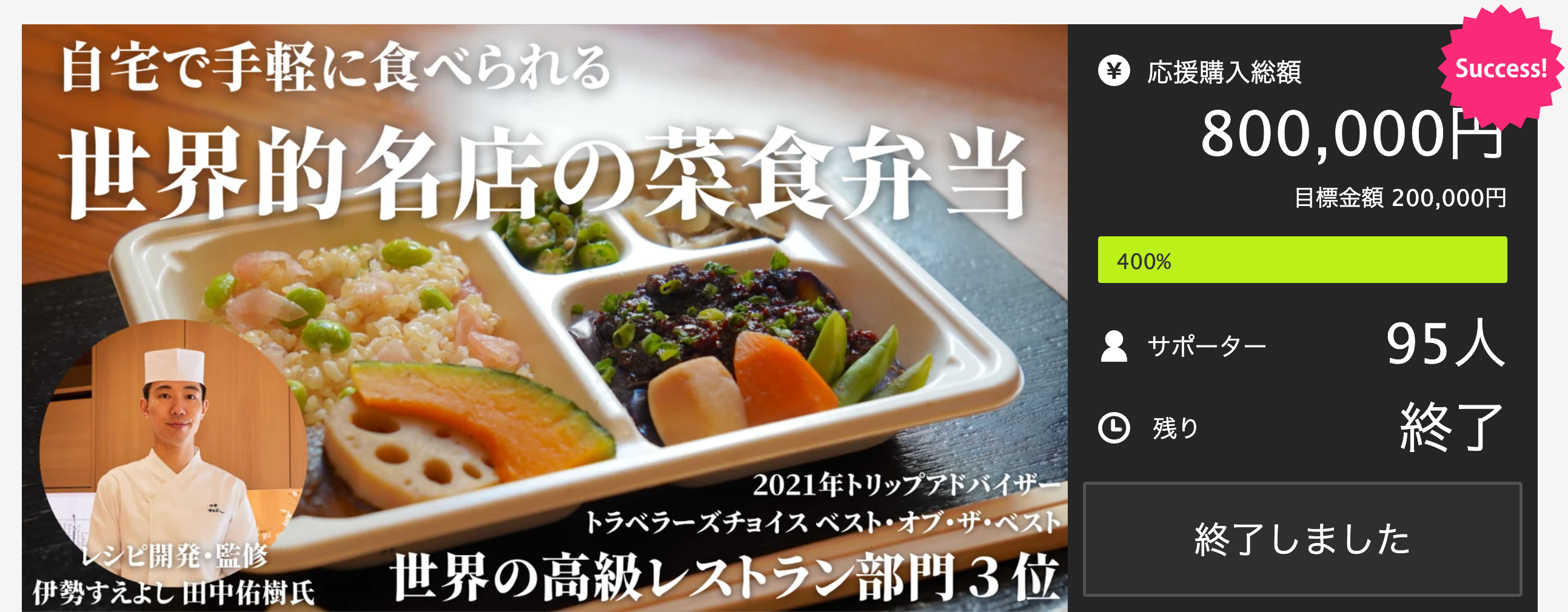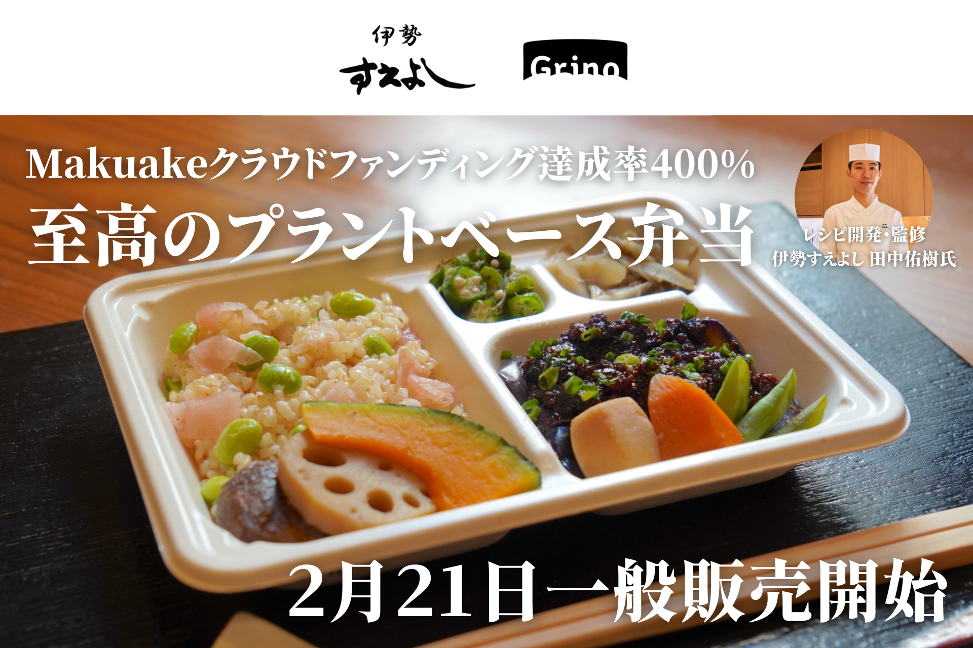 2022年12月16日〜2023年1月10日の期間におこなわれたGrino初のMakuakeチャレンジ『身体と環境を想うあなたへ “世界3位”の名店『伊勢すえよし』がつくる極上菜食弁当』にて、達成率400%のを記録。