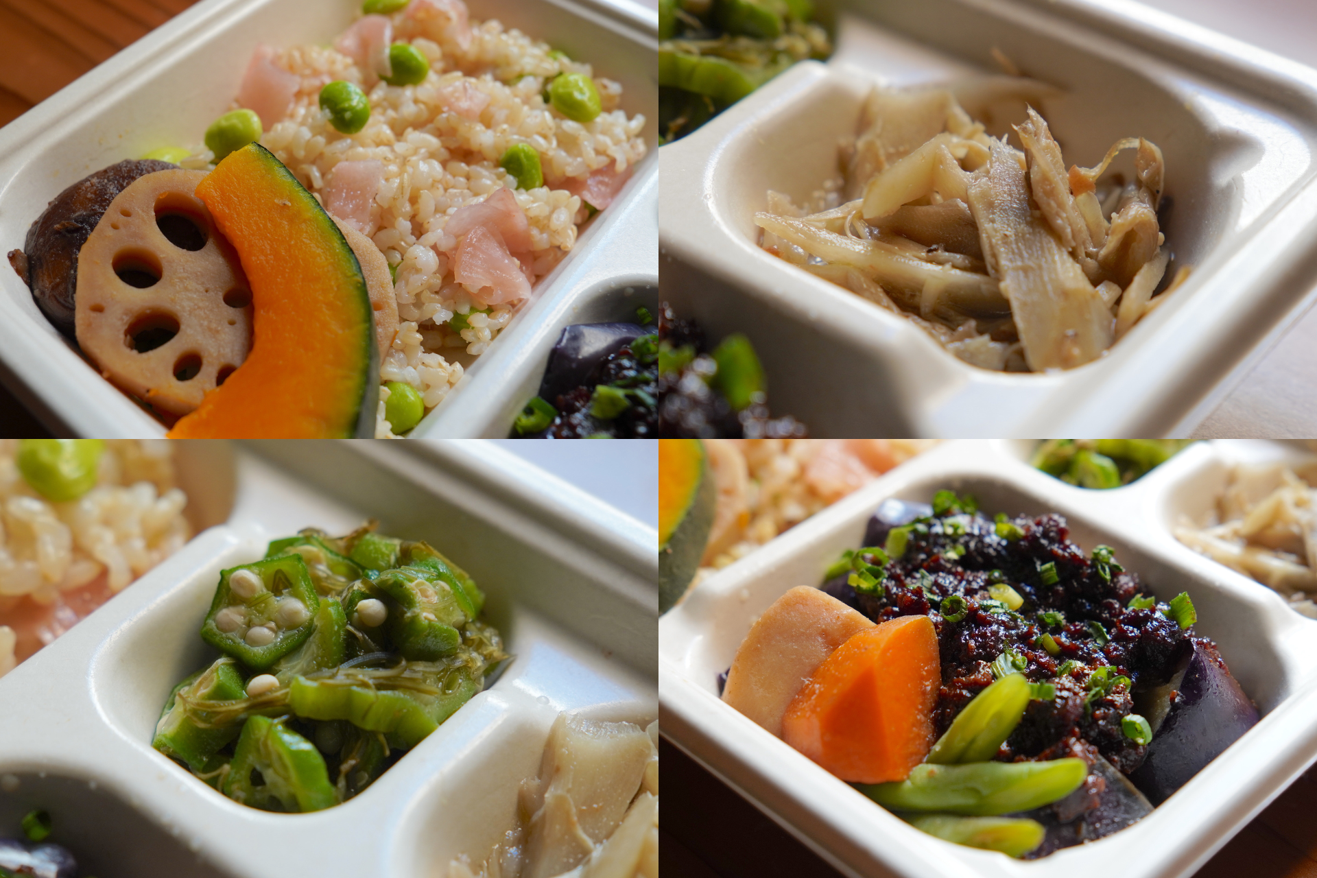 米(国産:信州産特別栽培米)、冷凍なす、むき枝豆、レンコン、生しいたけ、里芋、てんさい糖、桜大根、オクラスライス、みりん風調味料、八丁味噌、栗かぼちゃ、にんじん、冷凍いんげん、まいたけ、濃口醤油、大豆ミート、ごぼう、えのきたけ、長ねぎ、しいたけパウダー、オリーブ油、梅干し、上新粉、おろしにんにく、刻み昆布、並塩、米油、胡麻、黒こしょう、(一部に小麦・ごま・大豆を含む)